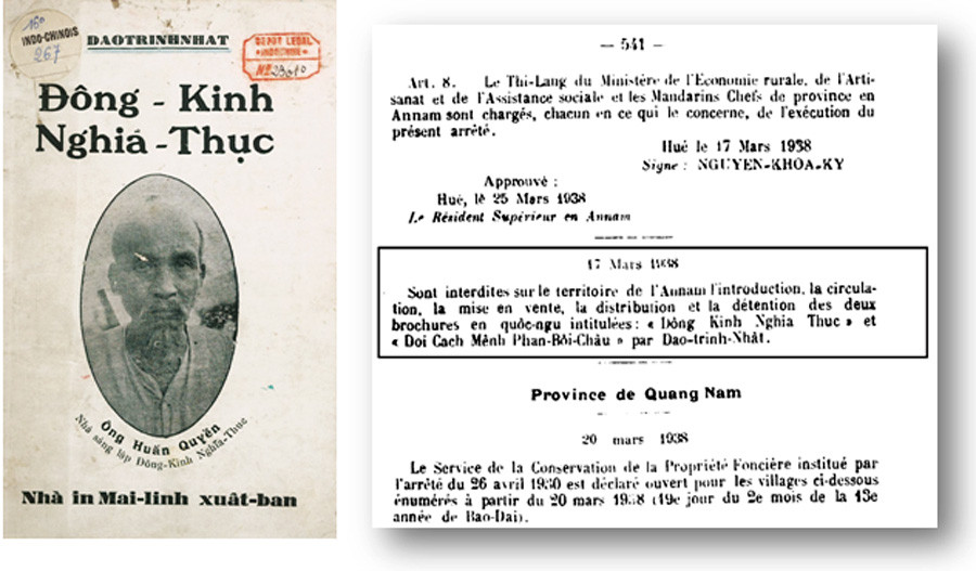 Trái: Bìa sách Đông Kinh Nghĩa Thục của Đào Trinh Nhất do nhà Mai Lĩnh xuất bản năm 1937 với ảnh chân dung của Giám học Nguyễn Quyền; Phải: Quyết định cấm 2 tác phẩm Đông Kinh Nghĩa Thục và Đời cách mệnh Phan Bội Châu được ban hành ngày 17 tháng 3 năm 1938 in trong Bulletin administratif de l'Annam, 1938/ 02/15-1938/ 08/09. Nguồn: Gallica, Thư viện Quốc gia Pháp