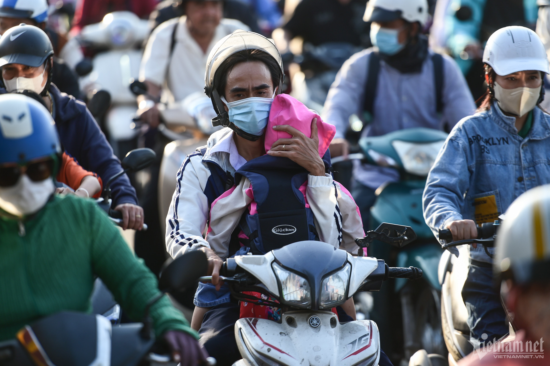Lộ trình bị thay đổi, một người đi xe máy một tay ôm trẻ nhỏ một tay vặn ga và bóp phanh để di chuyển.