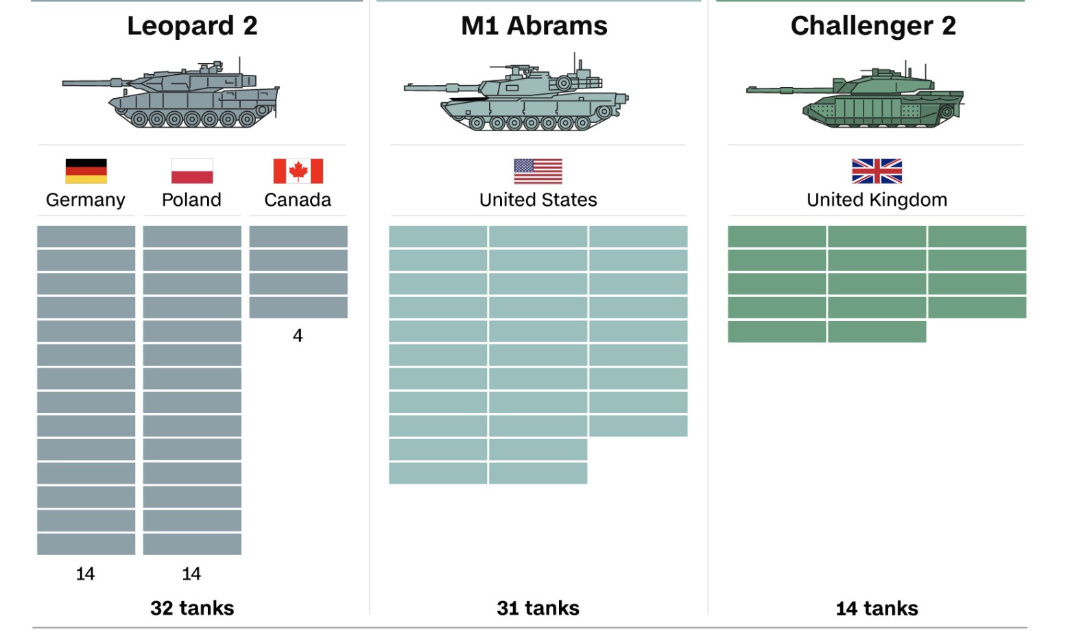 Theo hãng tin Reuters, trong vài tuần gần đây, các nước phương Tây đã cam kết gửi hàng trăm xe tăng và xe bọc thép hiện đại cho Ukraine để giúp nước này tiến hành cuộc phản công, tái kiểm soát lãnh thổ vào cuối năm 2023. Tuy nhiên, việc chuyển giao vũ khí sẽ mất nhiều tháng.