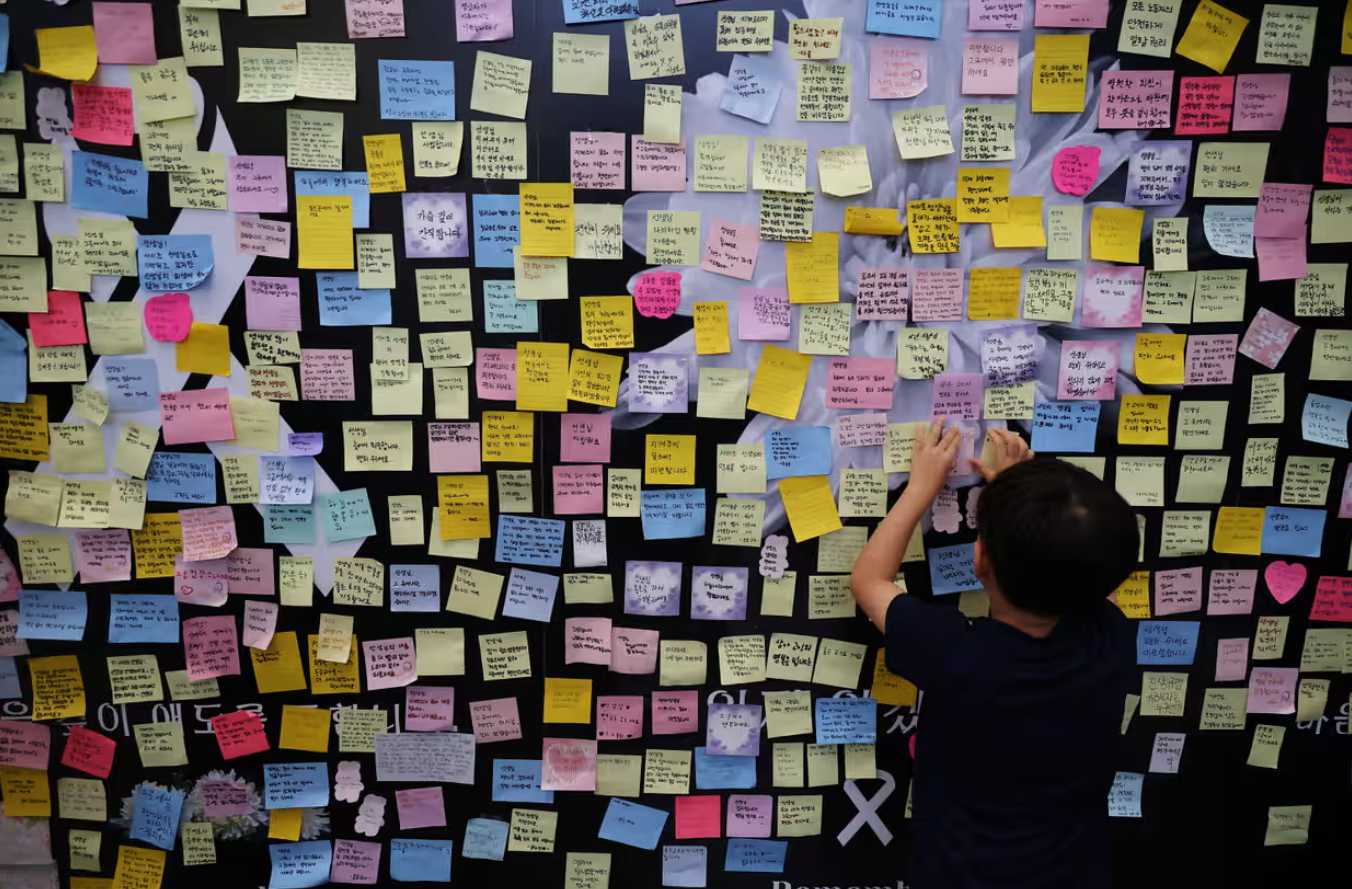 Một cậu bé để lại lời chia buồn trước một lớp học ở Seoul, nơi một giáo viên trẻ được phát hiện đã tự sát vào tháng 7/2023.