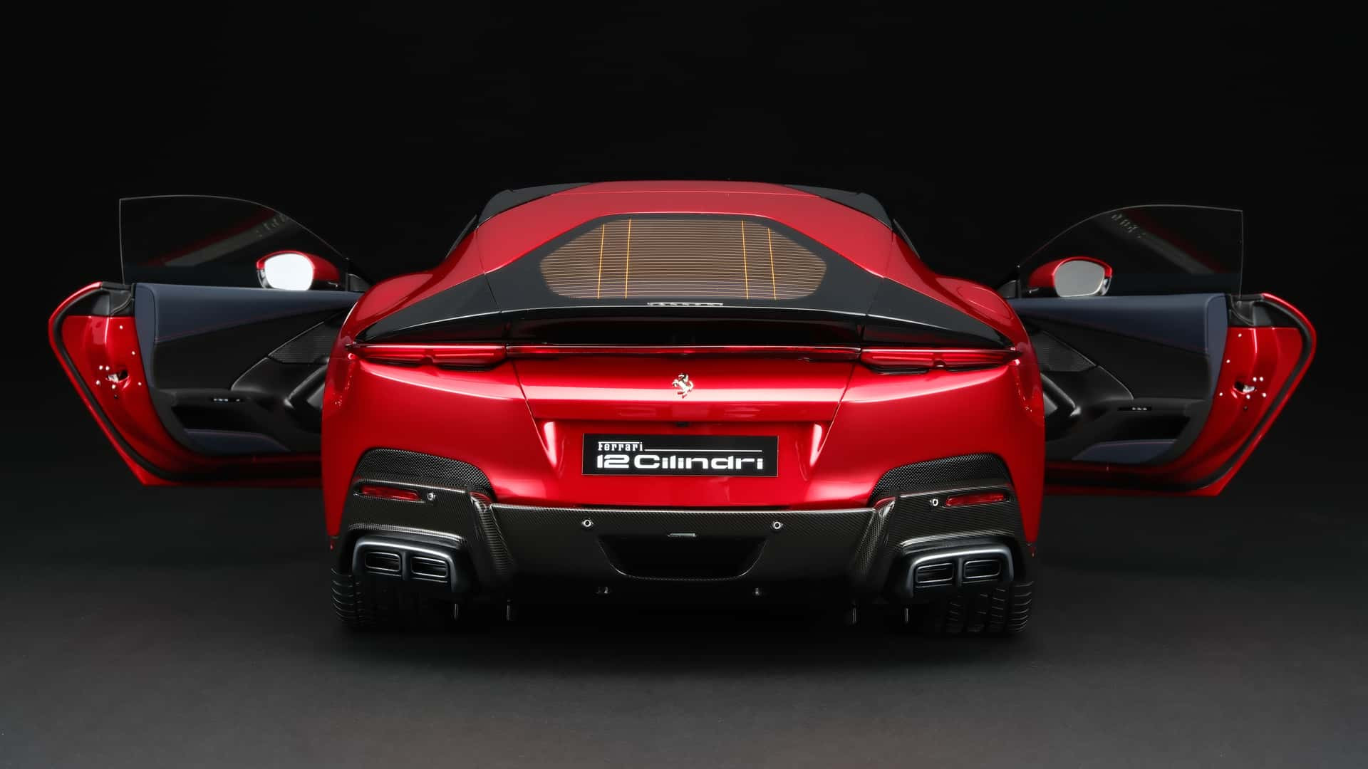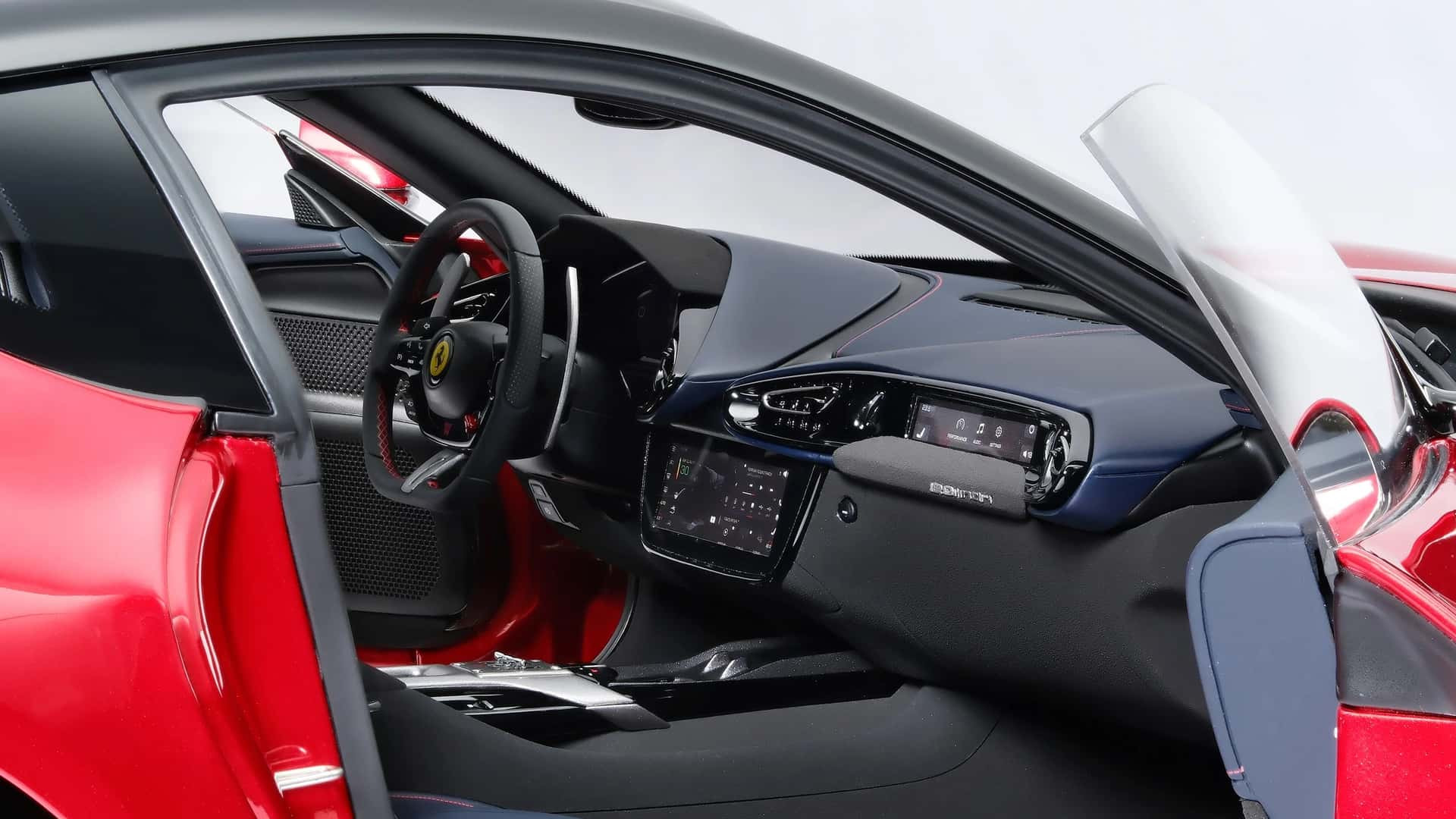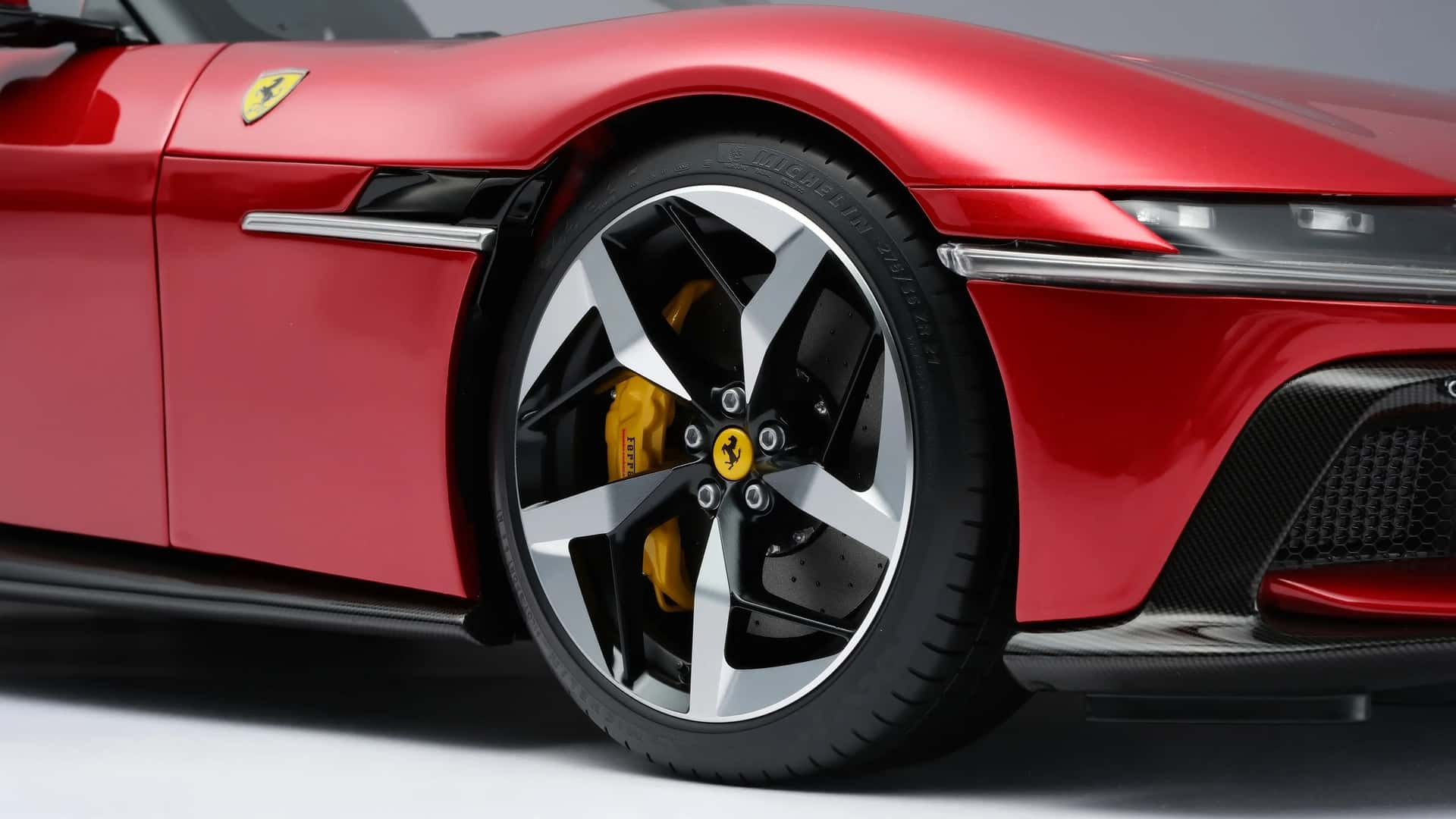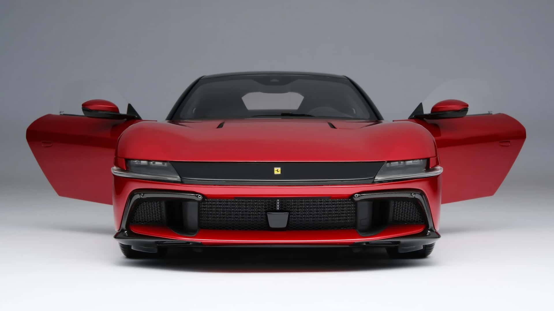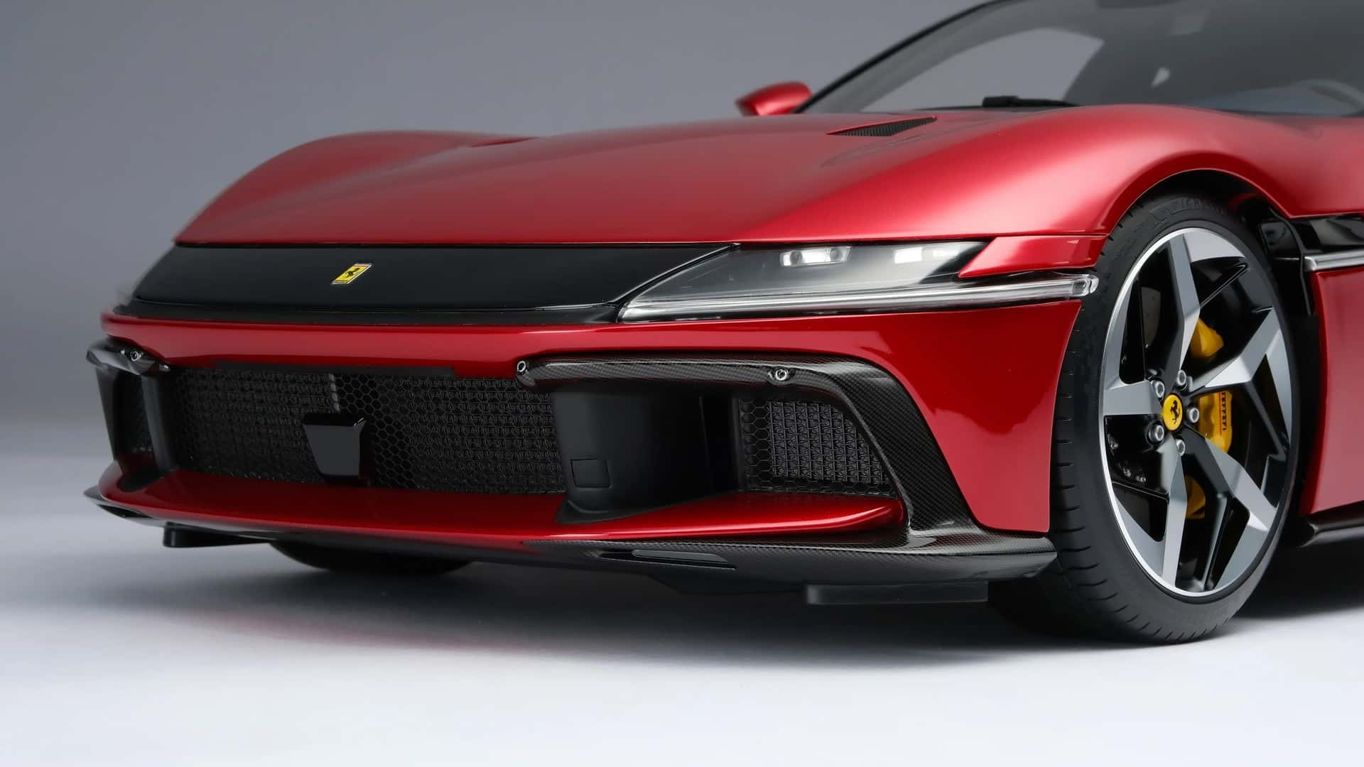 Mô hình chiếc siêu xe 12Cilindri vừa sản xuất có ngoại thất sơn màu đỏ Rosso Imola bắt mắt, với cản trước và sau mô phỏng lại chất liệu carbon một cách tỉ mỉ từng đường vân. Bộ mâm xe hay cụm đèn chiếu sáng đều được làm giống phiên bản tỷ lệ 1:1.