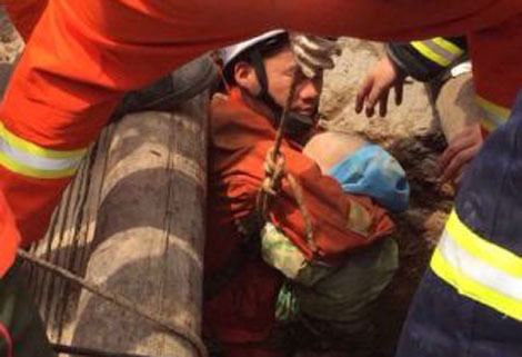 Theo CCTV News, em bé rơi xuống giếng bơm sâu 90m có đường kính chỉ 30cm nhưng may mắn đã mắc lại ở độ sâu 11m.