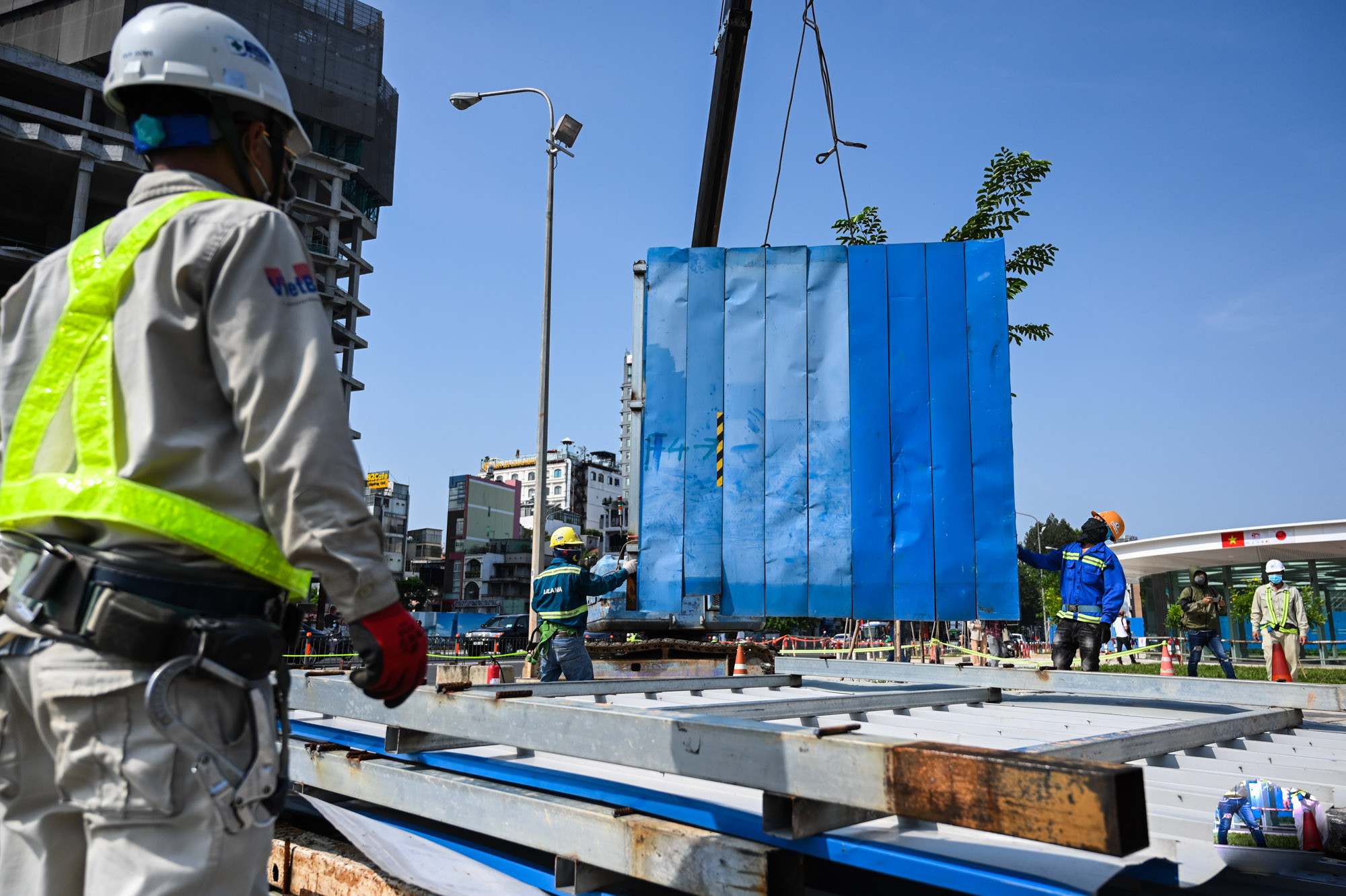 Sáng 25/4, hàng rào chắn giếng trời lấy sáng khổng lồ hình hoa sen của ga ngầm Bến Thành thuộc tuyến Metro được tháo dỡ, hoàn trả 8.000 m2 mặt bằng Công viên 23 tháng 9, vòng xoay Quách Thị Trang.