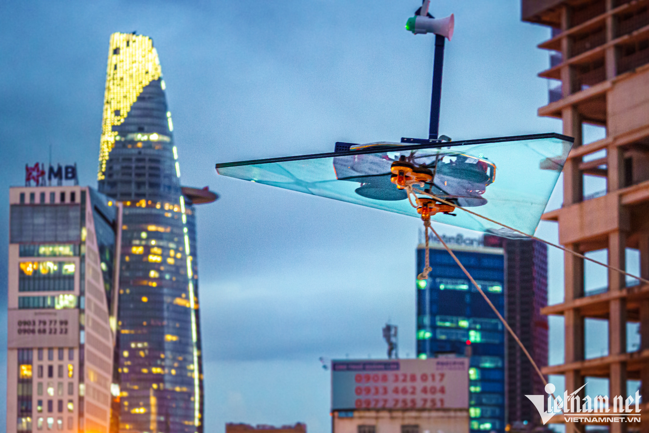 Công nhân sử dụng thiết bị chuyên dụng để cẩu các tấm kính từ nơi tập kết đến nơi lắp đặt.