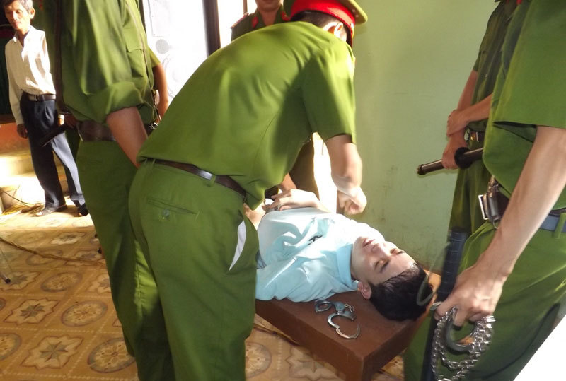Khi vừa được áp tải xuống xe chuyên dụng của cảnh sát, đối tượng Hồ Chí Bảo, kẻ giết hai người trong một gia đình để cướp tài sản, bị ngất lịm.