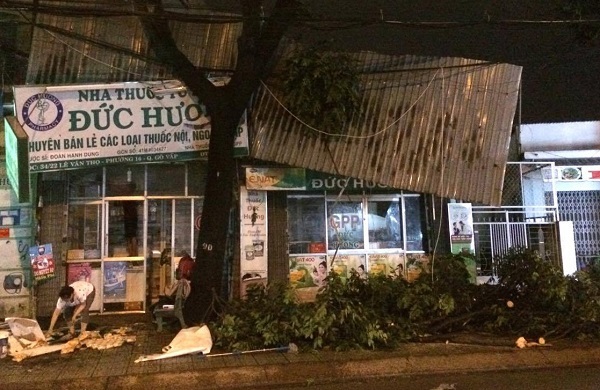 Theo ghi nhận, tiệm thuốc tây số 34 (phường 16) bị một nhánh cây lớn gãy đè sập mái tôn, nhiều đồ đạc trong tiệm bị hư hỏng. Hai nhân viên tiệm thuốc hốt hoảng tháo chạy ra ngoài.