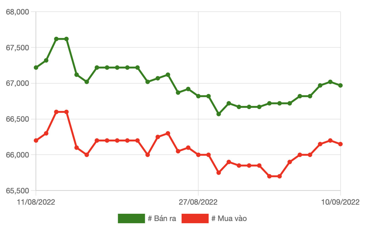 Kết thúc phiên 10/9, giá vàng miếng 9999 tại SJC Hà Nội là 66,15 triệu đồng/lượng (mua vào)- 66,95 triệu đồng/lượng (bán ra). SJC TP.HCM niêm yết ở mức 66,15 triệu đồng/lượng (mua vào) và 66,97 triệu đồng/lượng (bán ra).