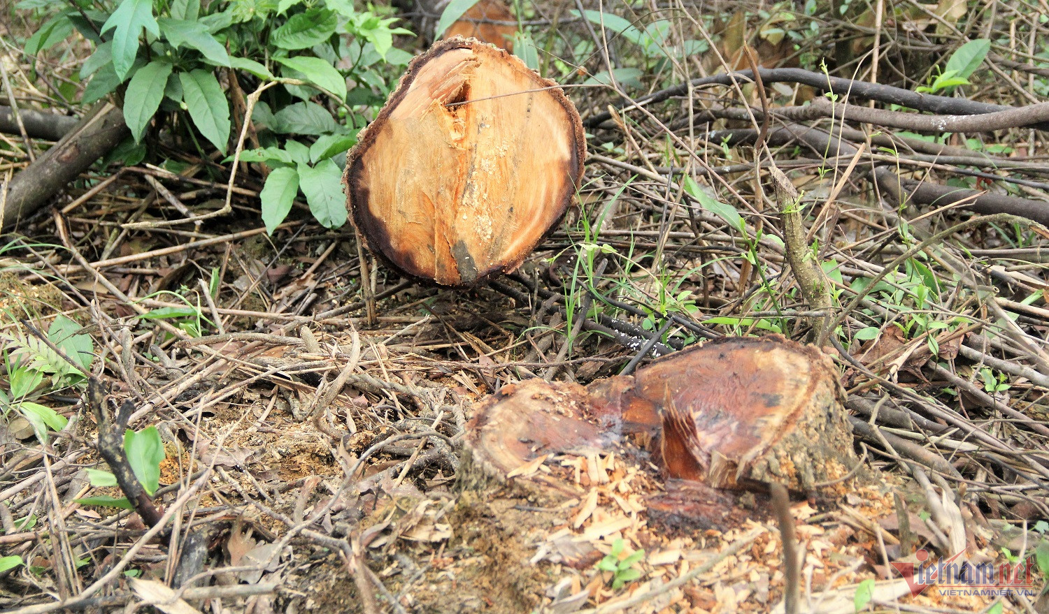 Đi ngược lên khu vực đỉnh núi, dễ thấy hàng chục cây gỗ rừng bị chặt hạ không thương tiếc, dấu vết vẫn còn rất mới. Nhiều phần thân được cưa xẻ từng khúc 2 – 4m nằm bên sườn núi; cành, ngọn vẫn ngổn ngang tại hiện trường.