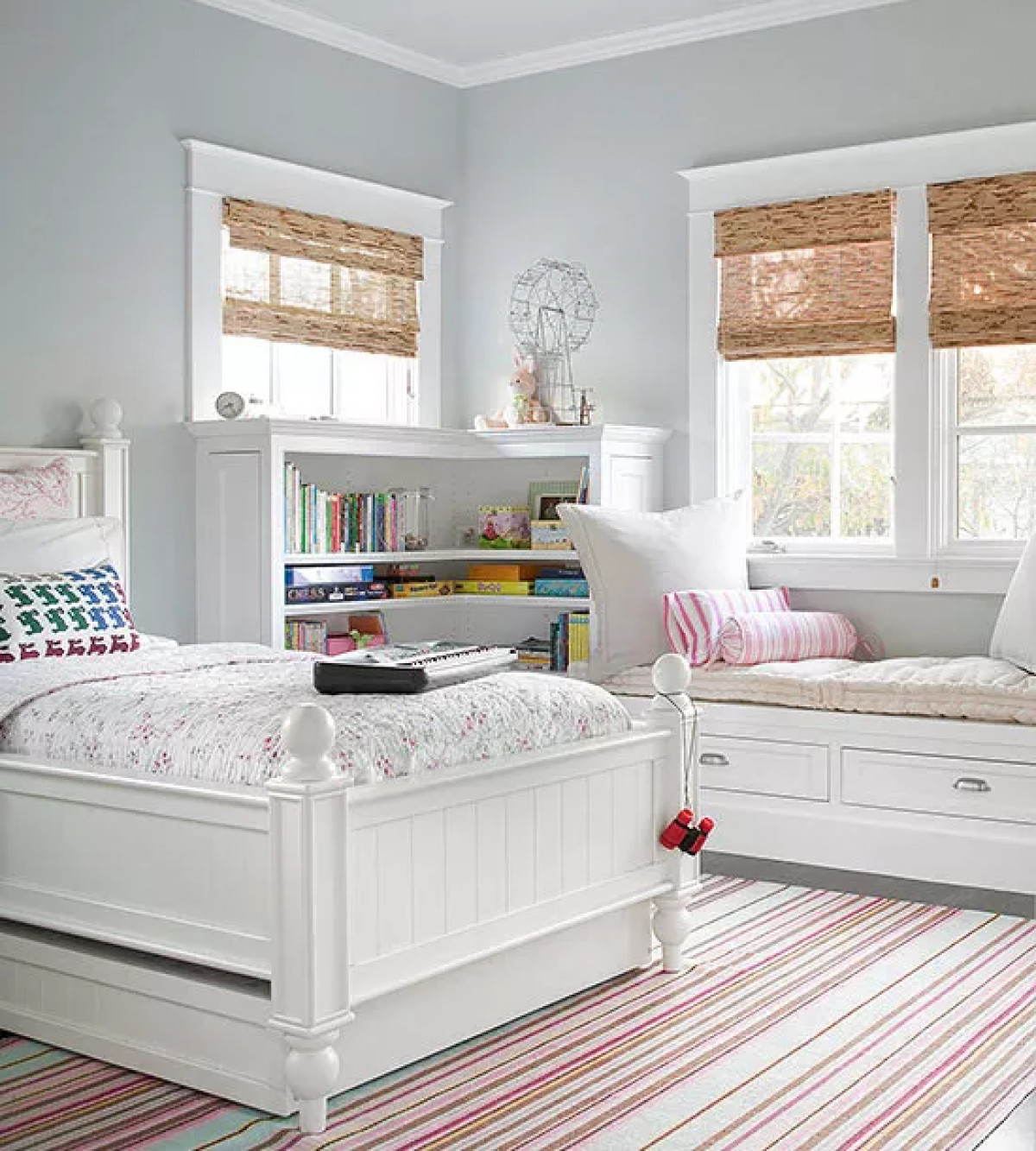 Nhiều đứa trẻ được ở chung phòng với anh chị em. Đó là một bài học về sự gắn bó và chung sống sẽ giúp ích cho con trong suốt cuộc đời. Đó cũng là một bài học về sống có tổ chức. Một số giường tầng thậm chí còn bao gồm cả bộ lưu trữ tích hợp, chẳng hạn như ngăn kéo dưới gầm hoặc đồ trang trí đầu giường. Trong trường hợp có 2 giường đơn, hãy sử dụng không gian bên dưới mỗi tấm nệm để chứa đồ và thả ga giường thõng xuống để che giấu. Ngoài ra, bạn cũng có thể làm cho con cảm thấy đặc biệt với các tác phẩm nghệ thuật và bộ đồ giường cá nhân hóa, phối hợp với cùng một màu sắc hoặc họa tiết nổi bật.