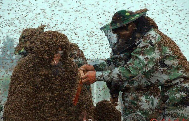 Một người nuôi ong ở Trung Quốc đã phá kỷ lục thế giới Guinness khi khoác lên mình chiếc áo choàng ong nặng tới 109,05kg.