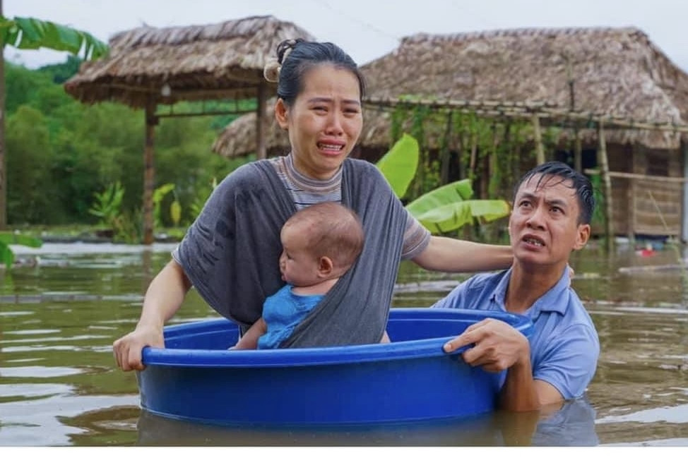 Hình ảnh người chồng cố gắng đẩy vợ con trong chậu, di chuyển trong khu vực ngập nước đang thu hút sự quan tâm của cộng đồng mạng. Tuy nhiên, đây chỉ là tình huống dàn dựng của Youtuber ở Hà Giang.