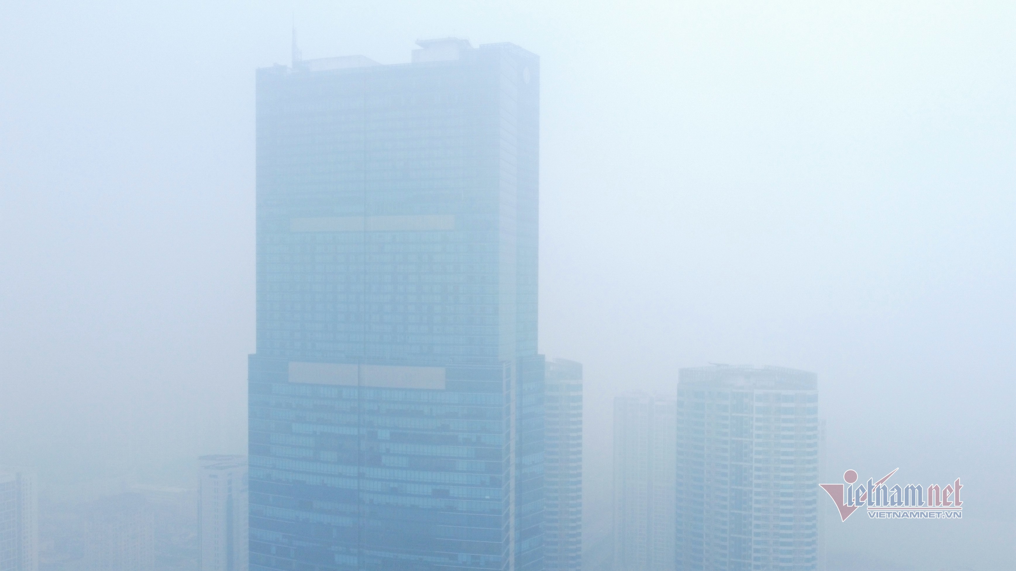 | Tòa tháp Keangnam trên đường Phạm Hùng (quận Nam Từ Liêm) mù mịt trong sương, mưa phùn |