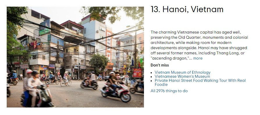 Đứng ở vị trí thứ 13, Hà Nội được giới thiệu là thủ đô bảo tồn tốt các di tích và kiến trúc lâu đời, đồng thời cũng có những bước phát triển hiện đại đầy đột phá. Tới Hà Nội, du khách không nên bỏ qua các điểm đến giàu tính lịch sử như Lăng Chủ tích Hồ Chí Minh hay Nhà tù Hỏa Lò. Hồ nước, công viên và các đại lộ rợp bóng cây cùng hơn 600 đền, chùa càng tăng thêm sức hút cho thành phố. Du khách có thể dễ dàng khám phá thành phố duyên dáng này bằng taxi.