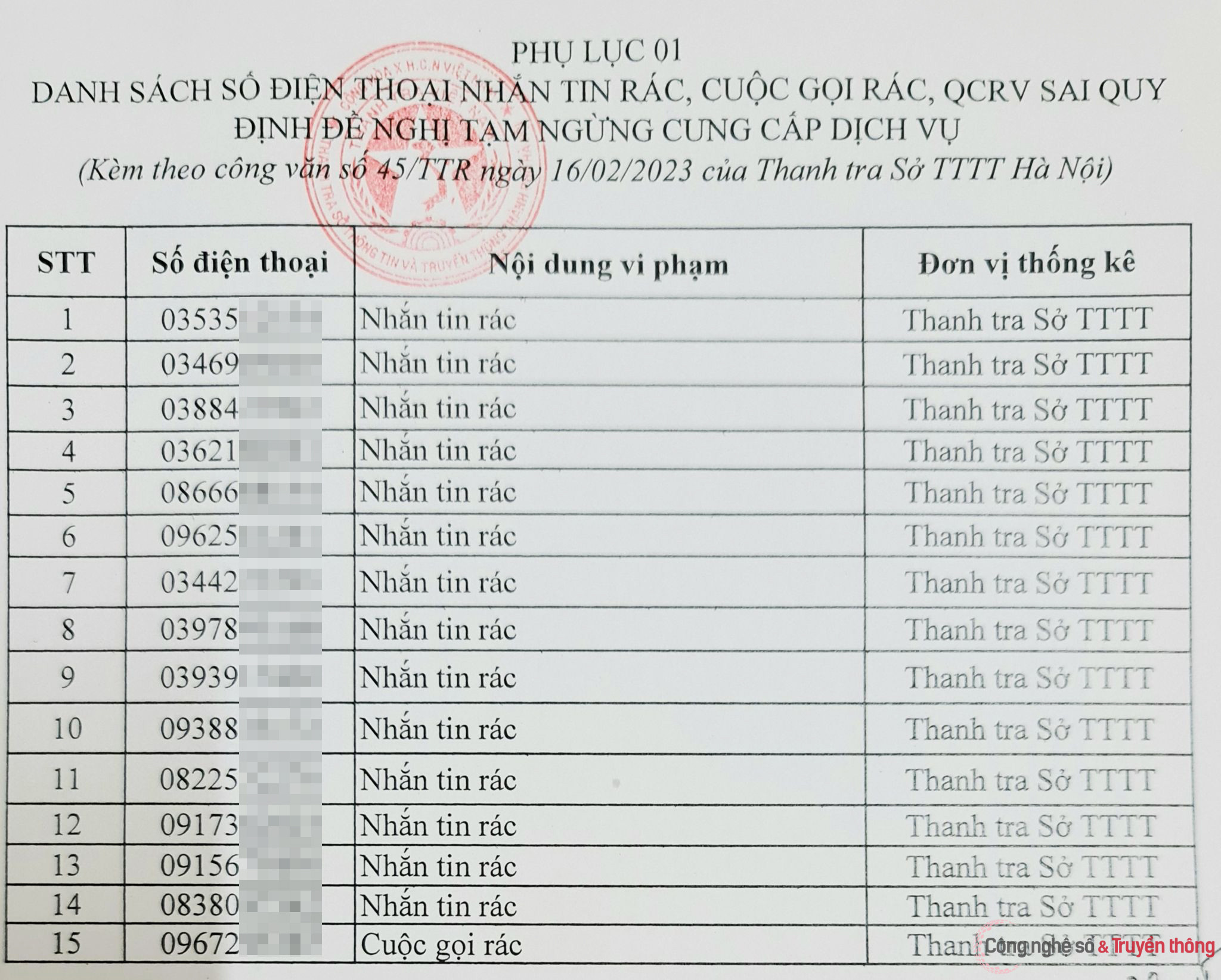 Trong quá trình tiếp nhận phản ánh của công dân, Thanh tra Sở Thông tin & Truyền thông (TT&TT) thành phố Hà Nội đã rà soát và phát hiện 15 số điện thoại thực hiện hành vi phát tán tin nhắn rác, cuộc gọi rác.
