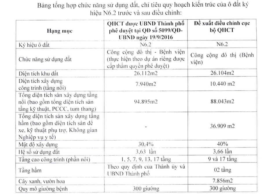 Sau khi điều chỉnh, tổng diện tích ô đất không đổi. Mật độ xây dựng khu đất tăng lên 40%, diện tích xây dựng tầng nổi 10.440 m2, hệ số sử dụng đất khoảng 3,7 lần, tổng diện tích sàn 88.043 m2, tổng diện tích sàn tầng hầm 36.909 m2, tầng cao công trình nổi gồm 2 khối nhà cao 9 và 17 tầng. Ngoài ra bổ sung 7.856 m2 cây xanh, vườn hoa, quy mô giường bệnh được giữ nguyên 300 giường.