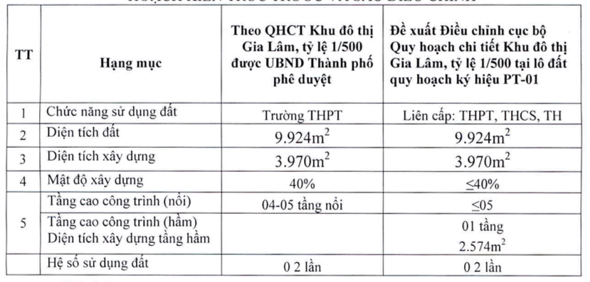 Nay, trên cơ sở Điều chỉnh cục bộ Quy hoạch phân khu đô thị N11, tỷ lệ 1/5000 được UBND TP phê duyệt, đề xuất Điều chỉnh cục bộ Quy hoạch chi tiết Khu đô thị Gia Lâm, tỷ lệ 1/500 với nội dung chính: giữ nguyên vị trí phạm vi ranh giới, quy mô diện tích lô đất quy hoạch ký hiệu PT-01, bổ sung thêm chức năng trường trung học cơ sở và tiểu học để xây dựng trường liên cấp gồm: tiểu học, trung học cơ sở, trung học phổ thông và bổ sung thêm 1 tầng hầm phục vụ đỗ xe và kỹ thuật phụ trợ.