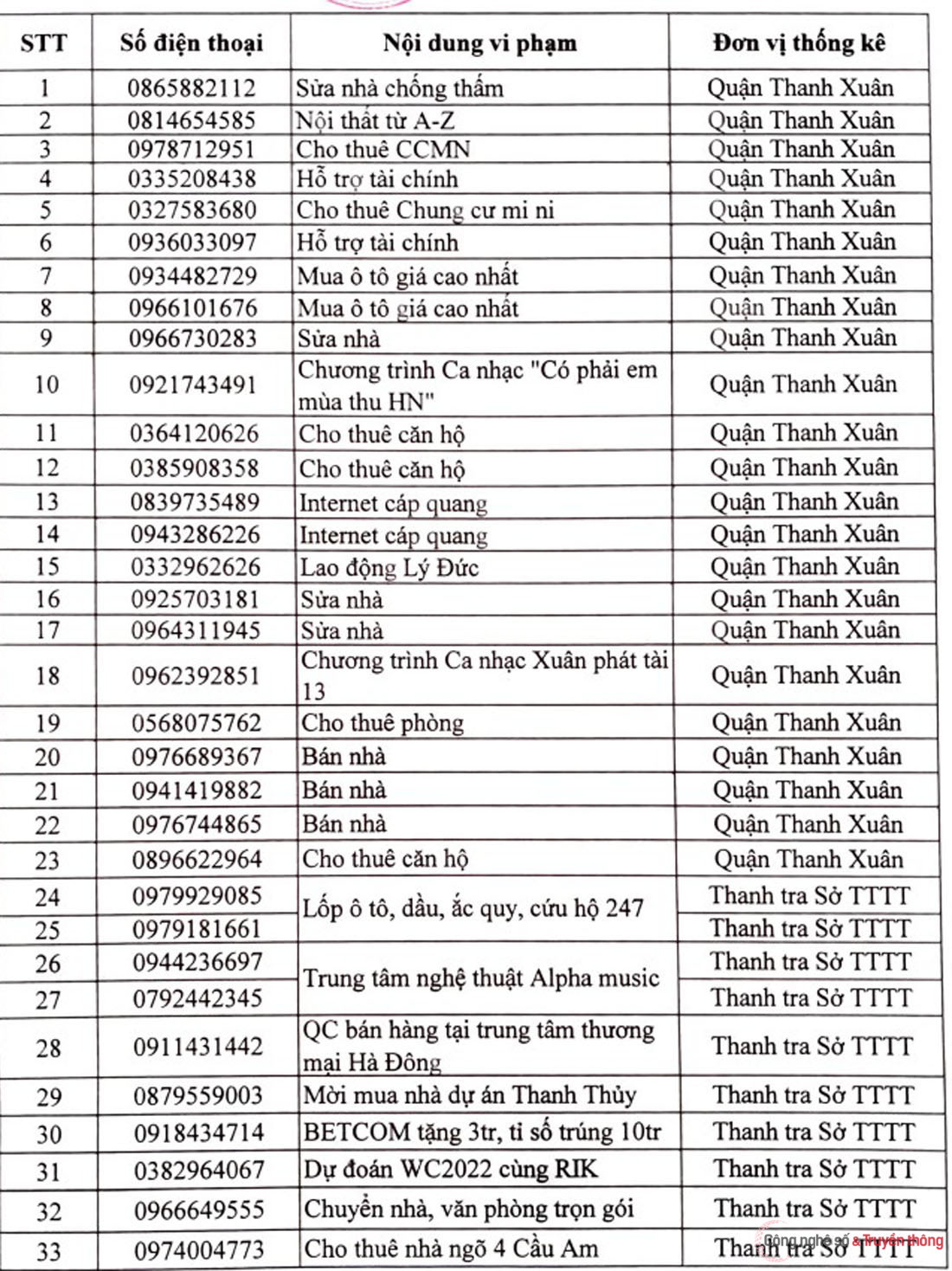 Danh sách 33 số điện thoại bị Thanh tra Sở TT&TT Hà Nội đề nghị doanh nghiệp viễn thông tạm ngừng cung cấp dịch vụ lần này được tiếp nhận và tổng hợp từ các đơn vị trên địa bàn. Thanh tra Sở cho biết thêm, chủ thuê bao của các số điện thoại vi phạm đã được thông báo mời đến làm việc, xử lý vi phạm nhưng không chấp hành theo quy định.