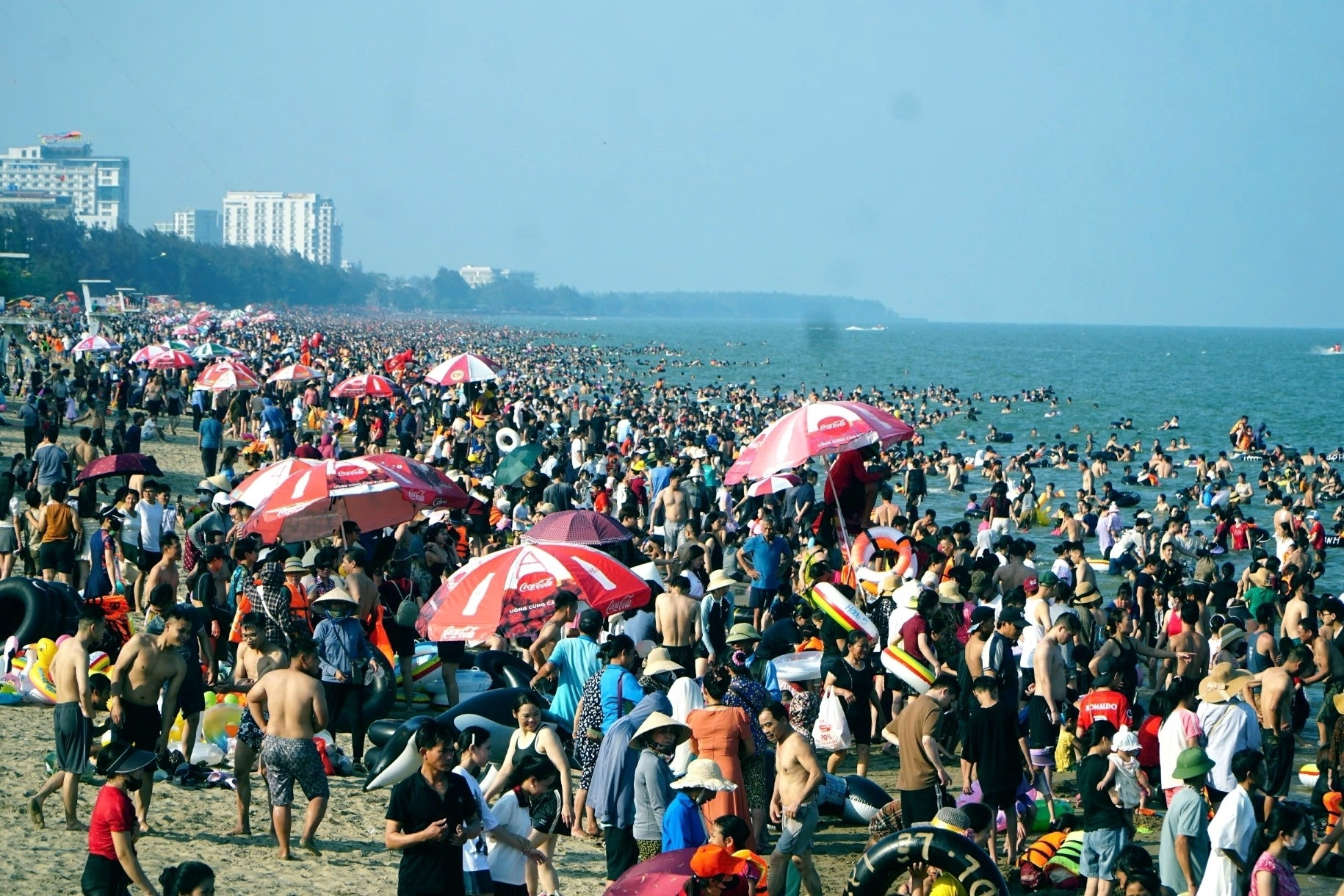 Cũng trong chiều 3/5, khu vực biển nhân tạo thuộc một khu đô thị gần Hà Nội đón hàng nghìn lượt khách đến vui chơi, bơi lội nhân dịp nghỉ lễ 30/4 - 1/5.