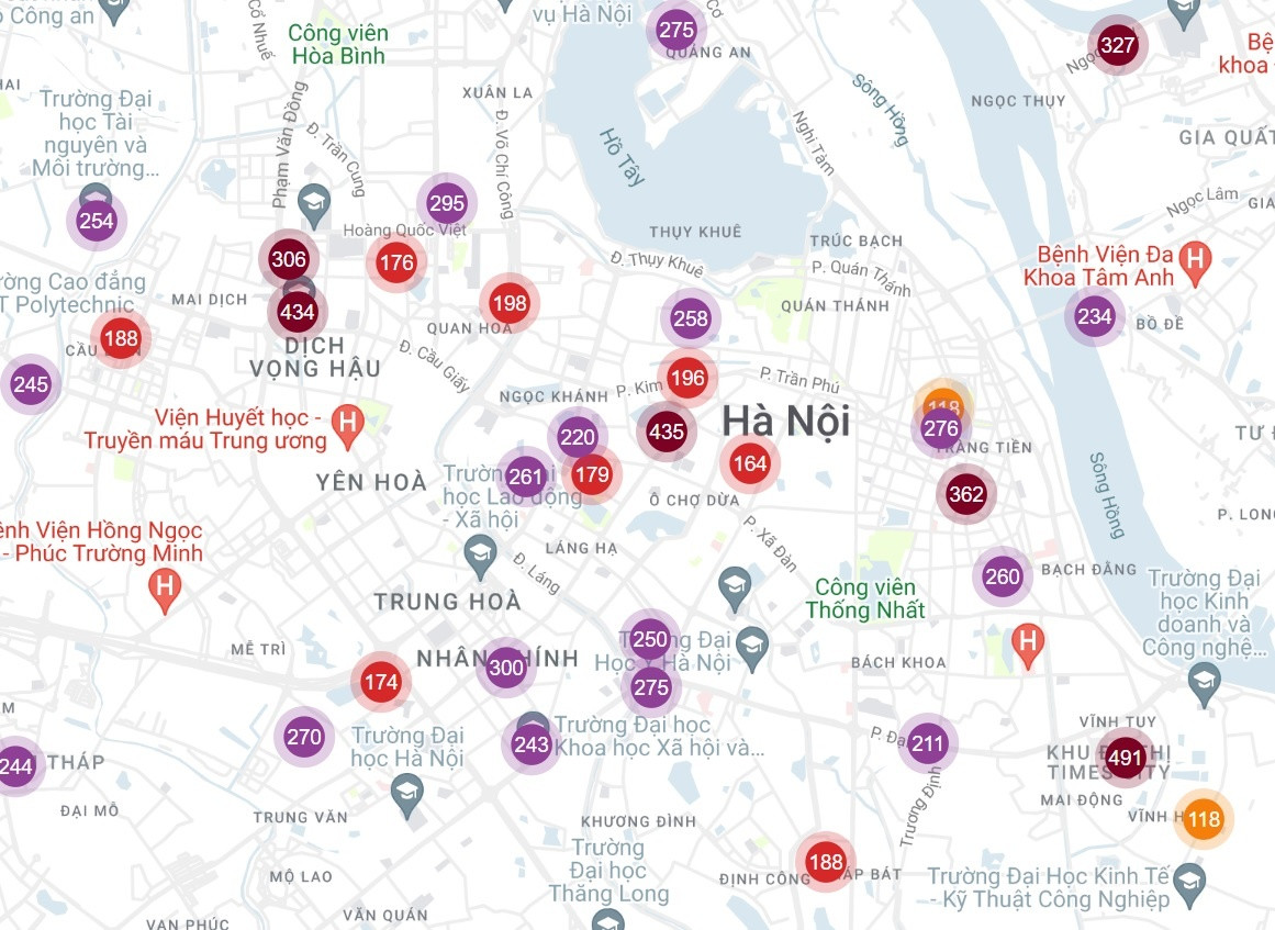 Các điểm có chỉ số AQI rất cao như Cầu Giấy 433, phố Phạm Tuấn Tài 305, Trường mầm non thực hành Hoa Sen 451, Thanh Xuân 318, Hoàn Kiếm 376. Cá biệt, Khu đô thị Time City lên tới con số 500.