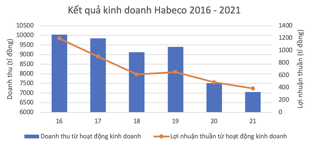 Về thị phần, Habeco mới chỉ tập trung ở phía Bắc, chính vì thế doanh thu không đạt như kỳ vọng. Sau năm 2015, kết quả kinh doanh của DN liên tục đi xuống. Doanh thu từ hoạt động kinh doanh của Habeco đạt đỉnh vào năm 2016 ở mức 10.032 tỷ đồng trước khi giảm dần xuống mức 9.405 tỷ đồng vào năm 2019.
