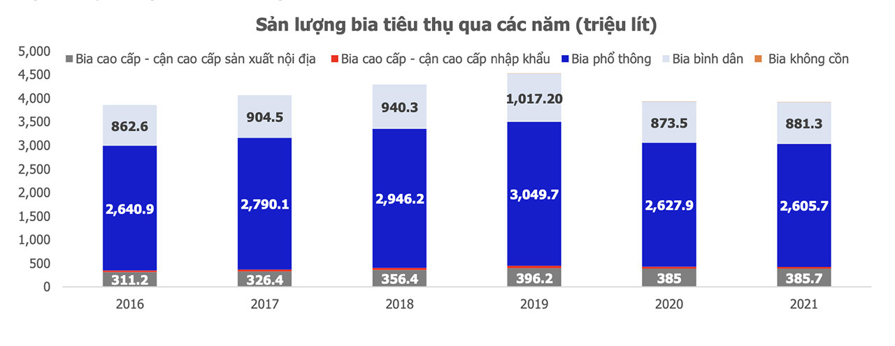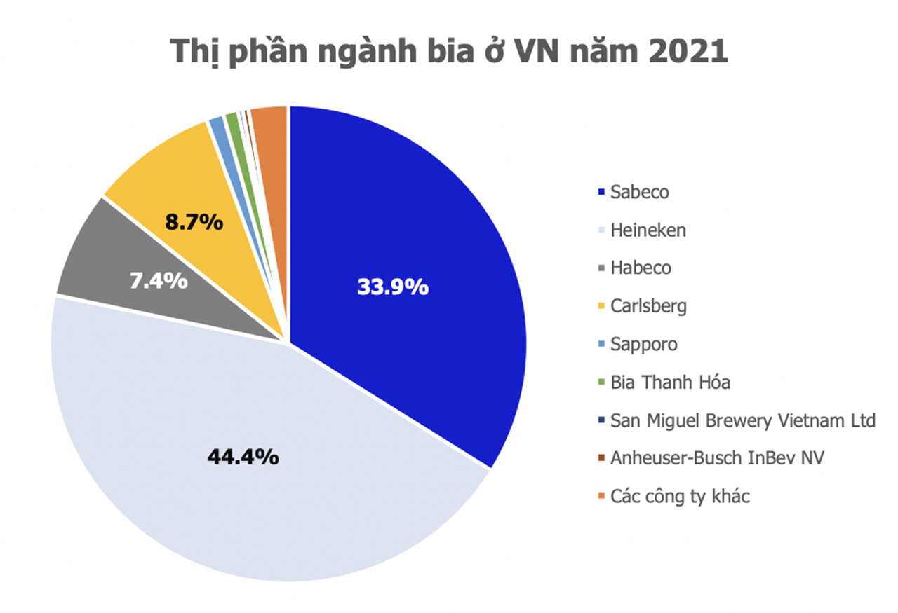 Qua nhiều năm, thị trường bia được thống trị bởi nhóm 4 hãng lớn, đó là Heineken, Sabeco, Carlsberg và Habeco. Bốn hãng này chiếm tới 94,4% thị phần ngành bia Việt Nam năm 2021, trong đó riêng Heineken và Sabeco có tổng thị phần là 78,3%, áp đảo hai hãng còn lại.