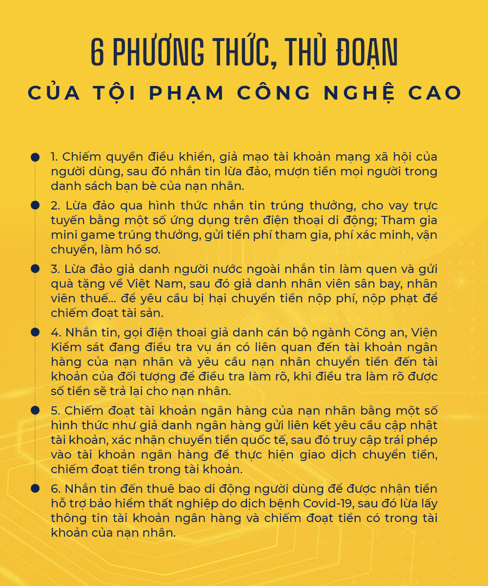 Đặc biệt, các đối tượng đã thu thập trái phép thông tin hàng nghìn khách hàng có hồ sơ vay vốn tín dụng ngân hàng, dùng các thông tin này để thực hiện hành vi lừa đảo chiếm đoạt tài sản. Chúng gọi điện tới người dân mời nâng cấp sim từ 4G lên 5G rồi chiếm quyền truy cập sim điện thoại, khôi phục lại mật khẩu đăng nhập tài khoản internet banking có liên kết với sim để chiếm đoạt tài khoản ngân hàng.