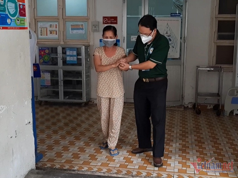 Bà Vũ Thị Thanh (SN 1968) run rẩy đứng dậy, vội vịn vào đôi tay đang đưa ra đỡ của nhân viên công tác xã hội. Gần 1 tháng ở bệnh viện chờ tin chồng, bà phải nhờ vào sự hỗ trợ của người khác mới có thể đi lại. Thậm chí, ngay cả việc xin cơm từ thiện, bà cũng không tự làm nổi.