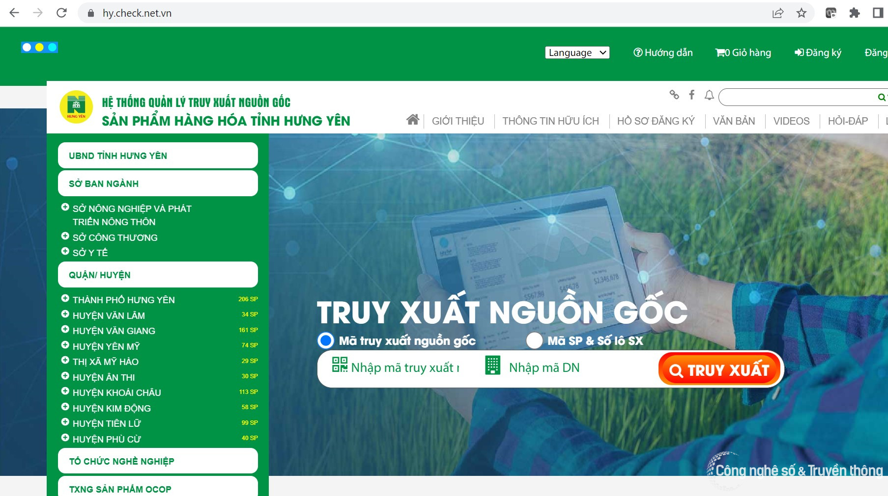 Đối với Hưng Yên, UBND tỉnh này đã giao Sở NN&PTNT tổ chức triển khai xây dựng cơ sở dữ liệu điện tử truy xuất nguồn gốc sản phẩm tại địa chỉ hy.check.net.vn, bàn giao tài khoản cho 10/10 huyện thị, xã thành phố quản lý hệ thống modul; xây dựng nâng cấp modul kết nối cung cầu sản phẩm (gồm phiên bản web và phiên bản mobile), module quản lý và đánh giá sản phẩm OCOP .... tạo sàn giao dịch điện tử cho các tổ chức, cá nhân có sản phẩm thực phẩm an toàn tham gia hệ thống.