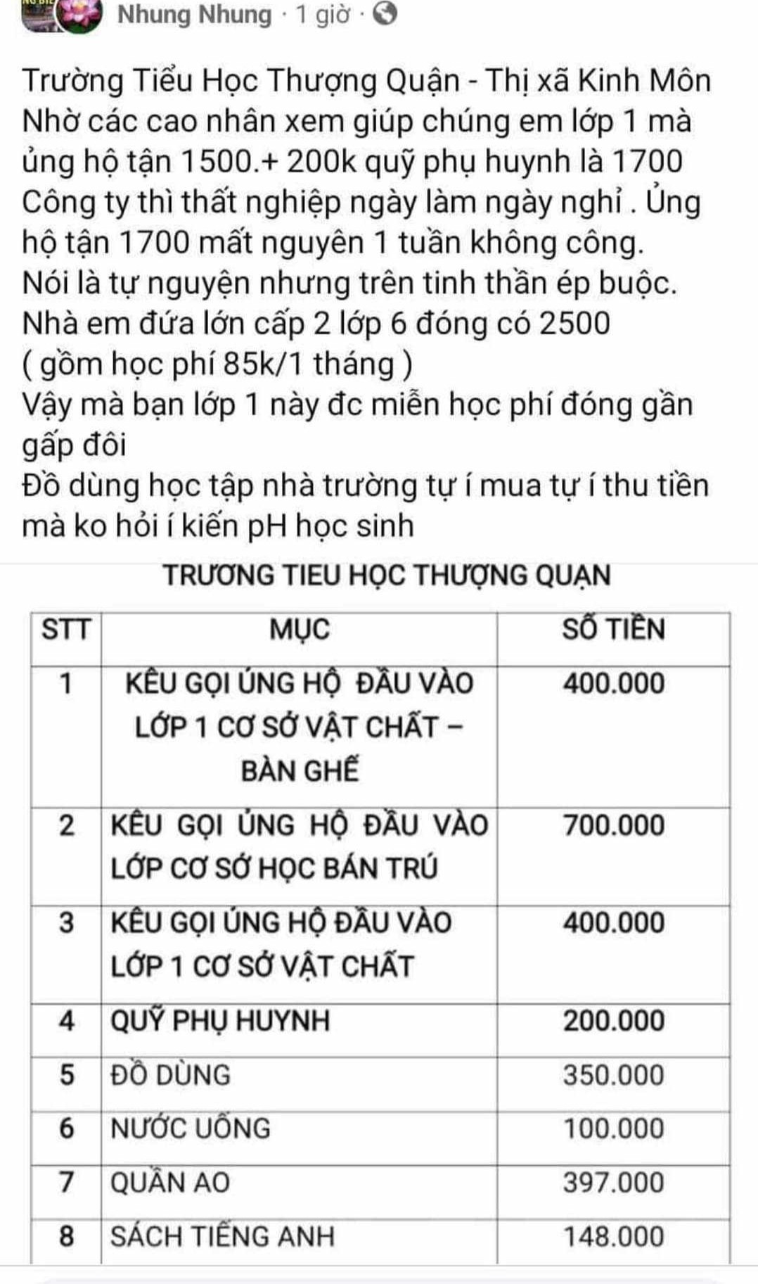 Khoản thu được người này cung cấp gồm: Kêu gọi ủng hộ đầu vào lớp 1 cơ sở vật chất - bàn ghế là 400.000 đồng; kêu gọi ủng hộ đầu vào lớp cơ sở học bán trú là 700.000 đồng; kêu gọi ủng hộ đầu vào lớp 1 cơ sở vật chất là 400.000 đồng; quỹ phụ huynh là 200.000 đồng. Tổng các khoản phụ huynh phải đóng nhân dịp đầu năm là 1,7 triệu đồng.