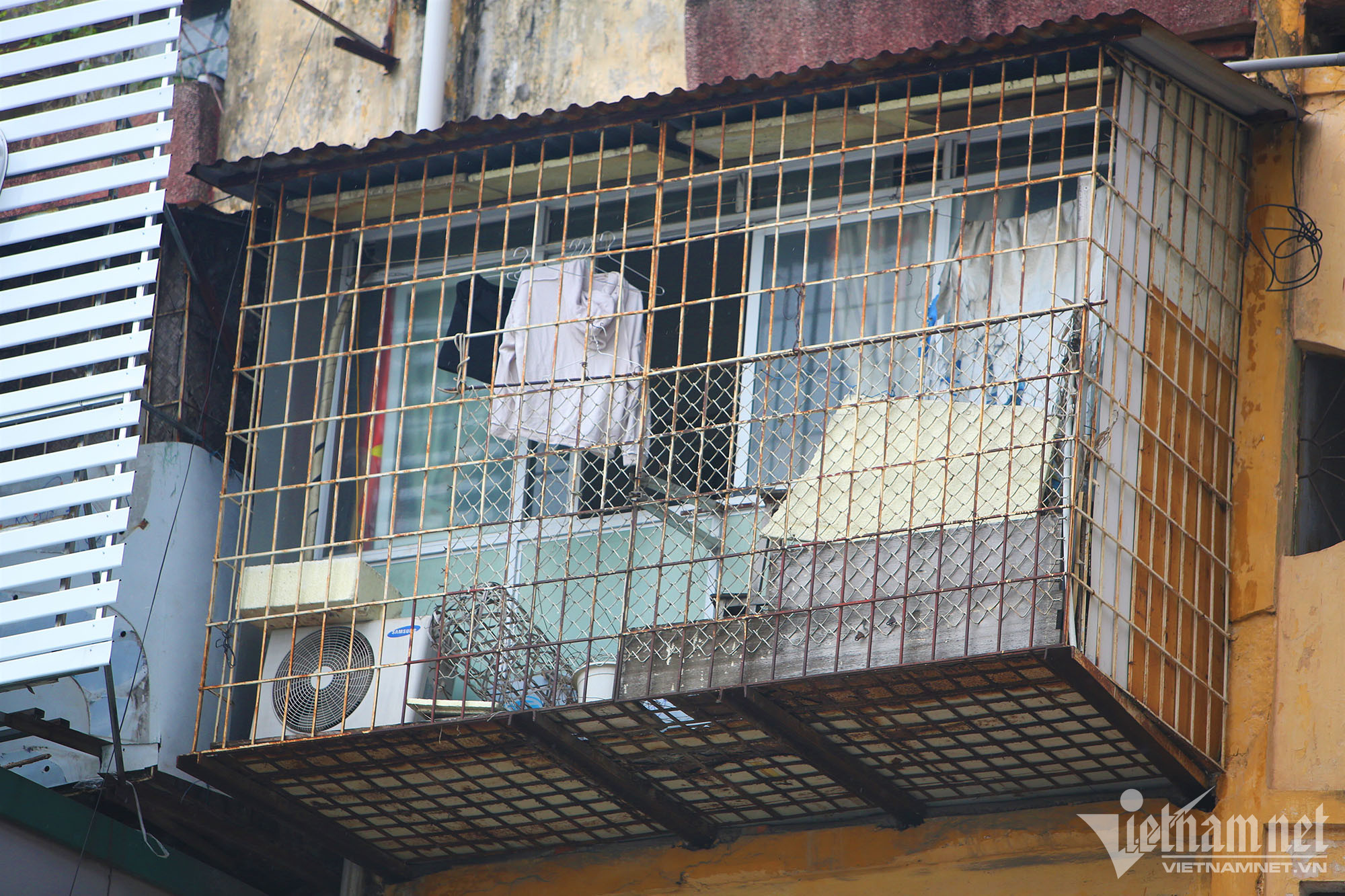 Tại chung cư cũ A12 phố Tôn Thất Tùng (Đống Đa), các “chuồng cọp” tầng tầng lớp lớp xếp chồng lên nhau. Có hộ gia đình chỉ làm lồng sắt, sàn gỗ để đua ra bên ngoài tăng diện tích nhưng có hộ lại thưng bên ngoài hàng rào sắt, bên trong xây kín.
