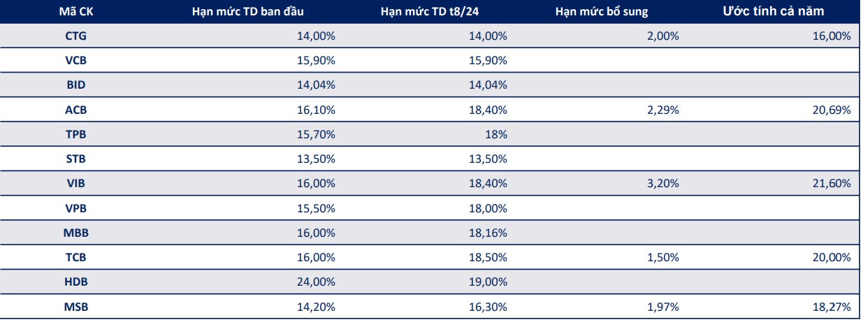 Dựa trên mức tăng trưởng tín dụng thực tế và chất lượng tài sản của các ngân hàng, theo báo cáo mới đây do Công ty Chứng khoán SHS phát hành, ước tính có 5 ngân hàng vừa được nới room tín dụng gồm: VietinBank bổ sung 2%, ước tính tăng trưởng tín dụng cả năm lên 16%; ACB bổ sung 2,29%, lên 20,69%; VIB bổ sung 3,2%, lên 21,6%; Techcombank bổ sung 1,5%, lên 20% và MSB bổ sung 1,97%, lên 18,27%.