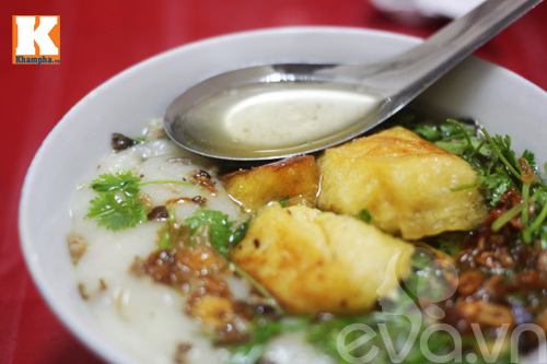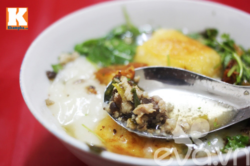 Nép sát một bên tường sau cây cột điện lớn, “hàng quán” của bà chủ chỉ chiếm một góc nhỏ ngay đầu một con ngõ trên phố Minh Khai. Quán có thâm niên cũng thuộc hàng lâu đời nhất nhì Hà Nội, cùng thời với quán bánh đúc nóng Lê Ngọc Hân, nhưng hàng quán đơn sơ hơn và mức giá cũng chỉ bằng một nửa.