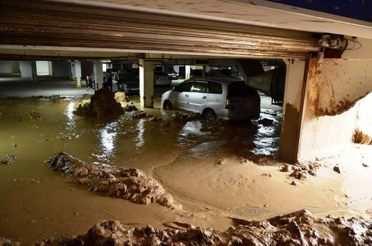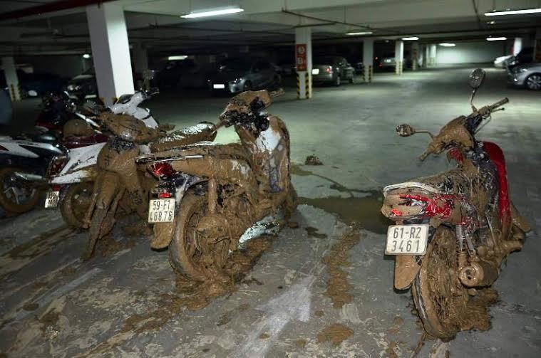 Trưa 15/7, tường hầm dày chừng 15 cm của chung cư Giai Việt bị vỡ toác. Hàng trăm tấn bùn tràn vào, vùi lấp gần 20 chiếc xe máy và 2 ôtô.
