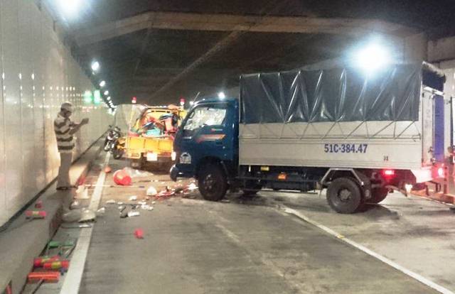 Đang làm vệ sinh trong đường hầm vượt sông Sài Gòn, 5 công nhân bị chiếc xe tải loại 1,5 tấn lao tới húc văng nhiều mét.