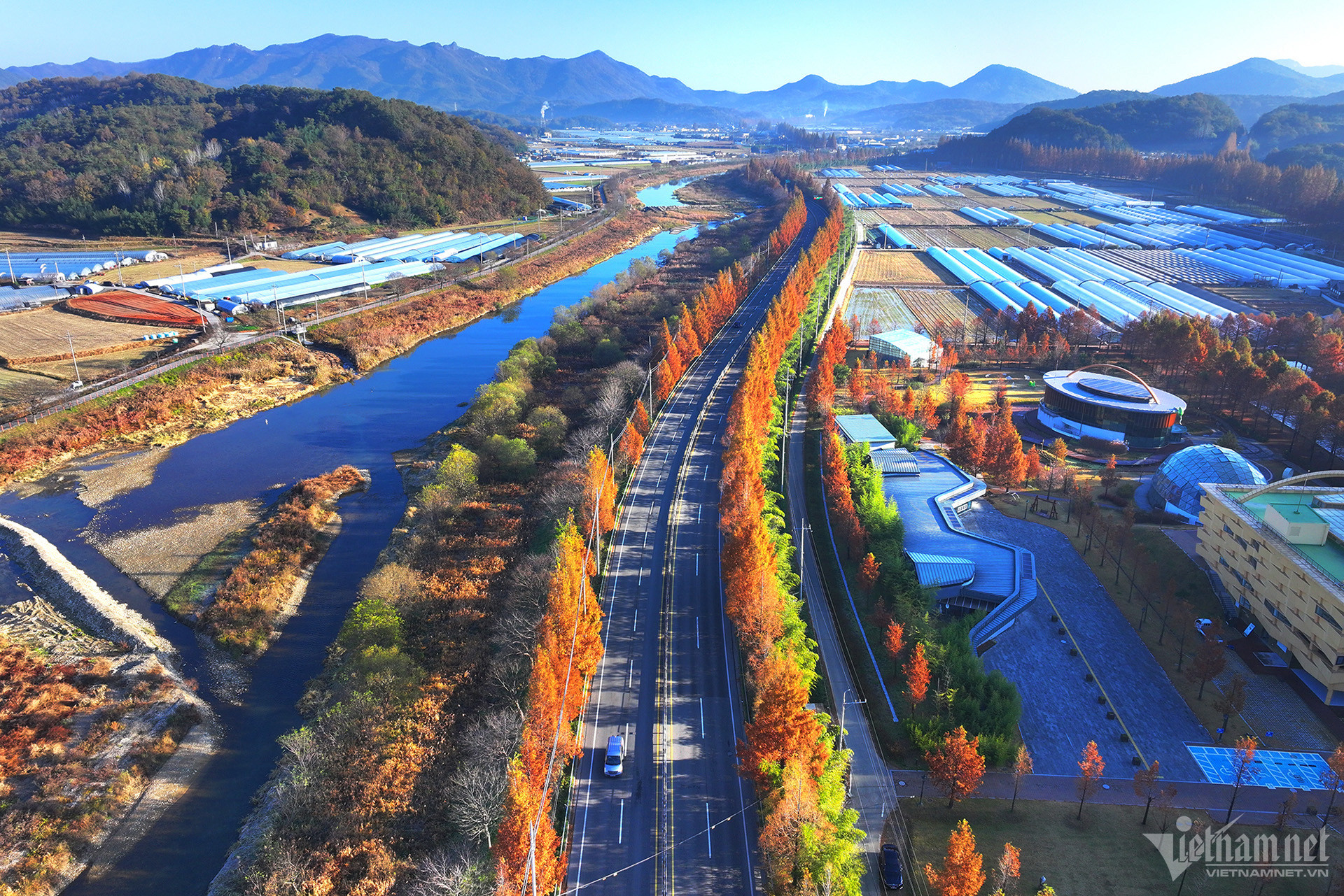 Một trong những địa danh nổi tiếng không thể không nhắc đến mỗi khi Hàn Quốc vào thu là con đường hàng cây thủy sam già thẳng tắp được trồng từ những năm 1970. Tháng 11, cả khu vực này được nhuộm các màu vàng, cam, đỏ rực, đẹp lãng mạn, thu hút rất nhiều du khách và người dân tới dạo chơi.
