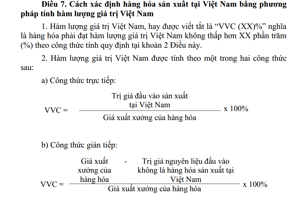 Cụ thể, quy định hàng hóa được coi là hàng hóa sản xuất tại Việt Nam khi đáp ứng một trong các tiêu chí sau: hàng hóa có xuất xứ thuần túy Việt Nam, hàng hóa được sản xuất tại Việt Nam từ toàn bộ nguyên liệu có xuất xứ Việt Nam; hàng hóa trải qua công đoạn gia công, chế biến cuối cùng tại Việt Nam làm thay đổi cơ bản tính chất của hàng hóa.