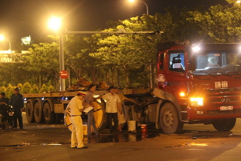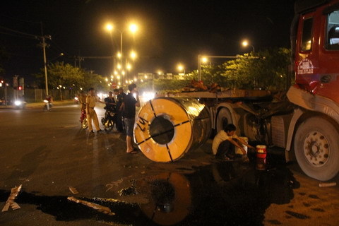 Tại hiện trường chúng tôi ghi nhận, một cuộn thép nằm cạnh xe đầu kéo. Dầu nhớt từ xe tuôn tràn trên mặt đường. 2 cuộn còn lại lăn xe cách xe vài chục mét. Trên rơ-móc, các dây xích giữ 3 cuộn thép đã bị bung.