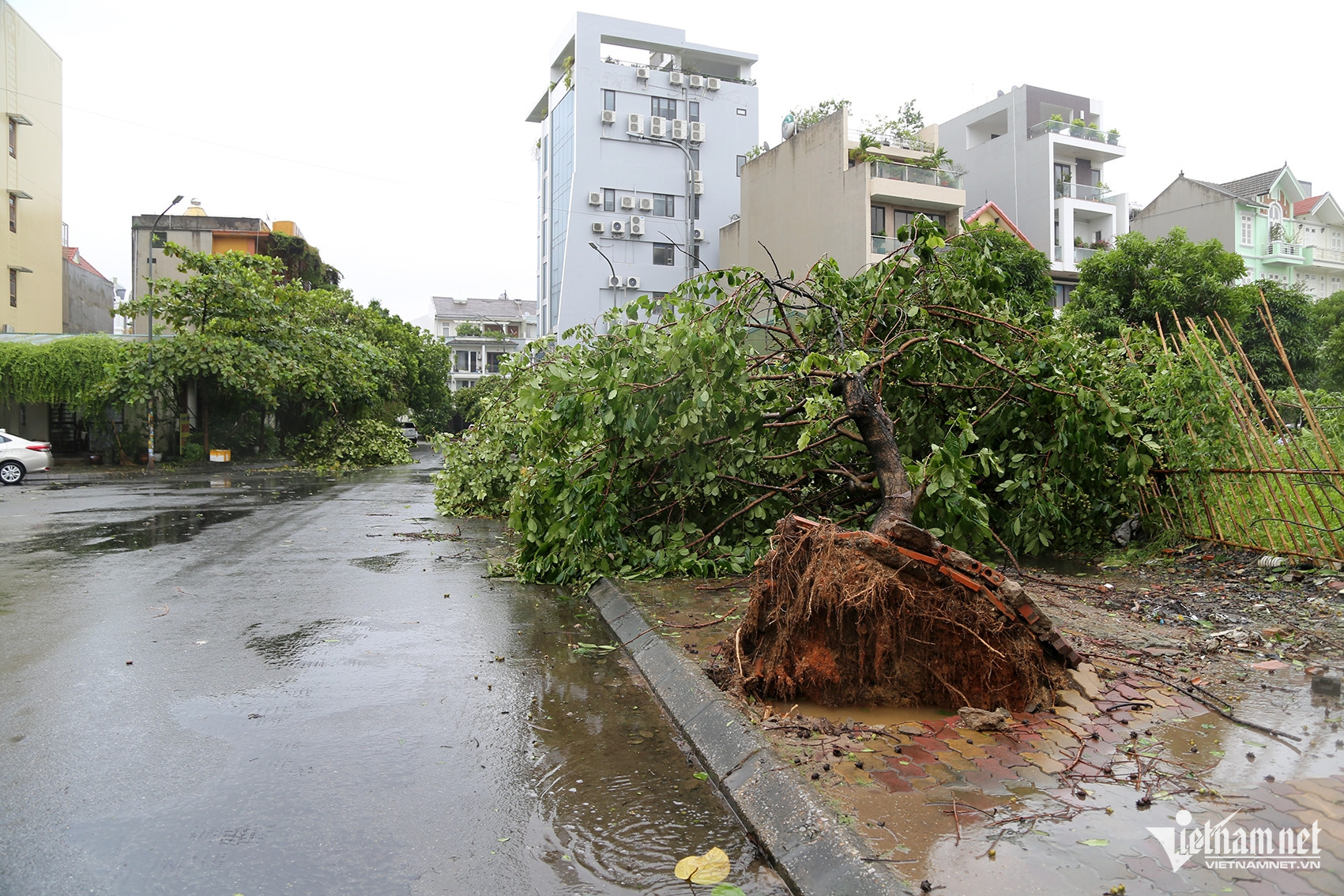 Tại đường Trần Quốc Nghiễn, cây xanh đô thị đổ ngang, công nhân môi trường căng mình dọn dẹp. Nhiều nhà hàng tại tuyến đường này cũng bị thiệt hại khi gió thổi bay biển quảng cáo. Phần mái của một số nhà vệ sinh công cộng cũng bị gió hất xuống lòng đường.