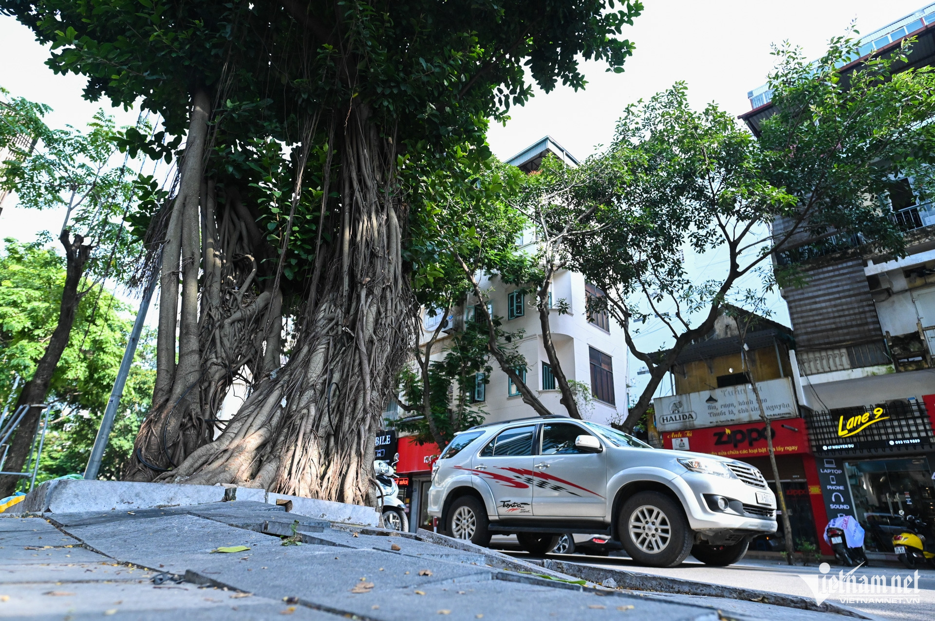 Tại phố Nguyễn Du cách đó không xa, một cây cổ thụ gốc to nghiêng hẳn về phía lòng đường. Bộ rễ lớn cày xới khiến vỉa hè nứt gãy.