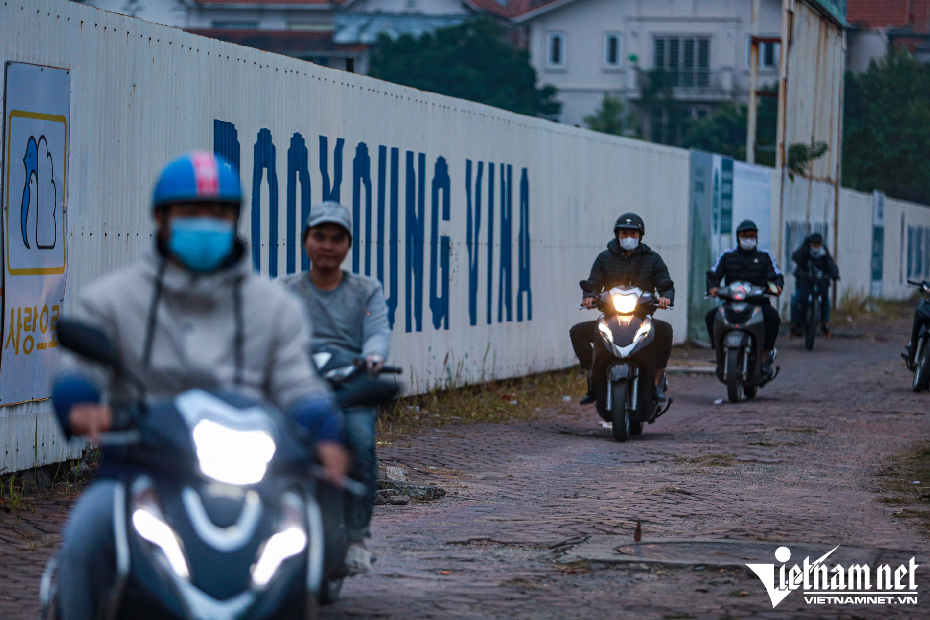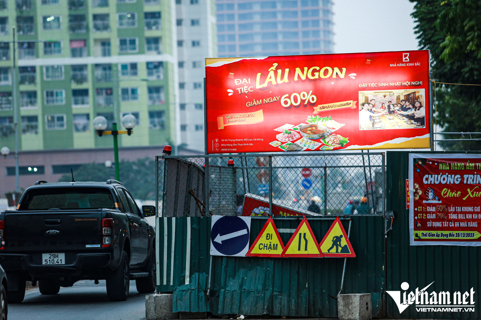 Giờ cao điểm hằng ngày, hàng nghìn phương tiện từ đường Trần Phú (quận Hà Đông) ùn ùn đổ về đường Vũ Trọng Khánh. Để qua các lô cốt đang án ngữ tại đây, dòng phương tiện phải xếp hàng dài, nhích từng chút một.