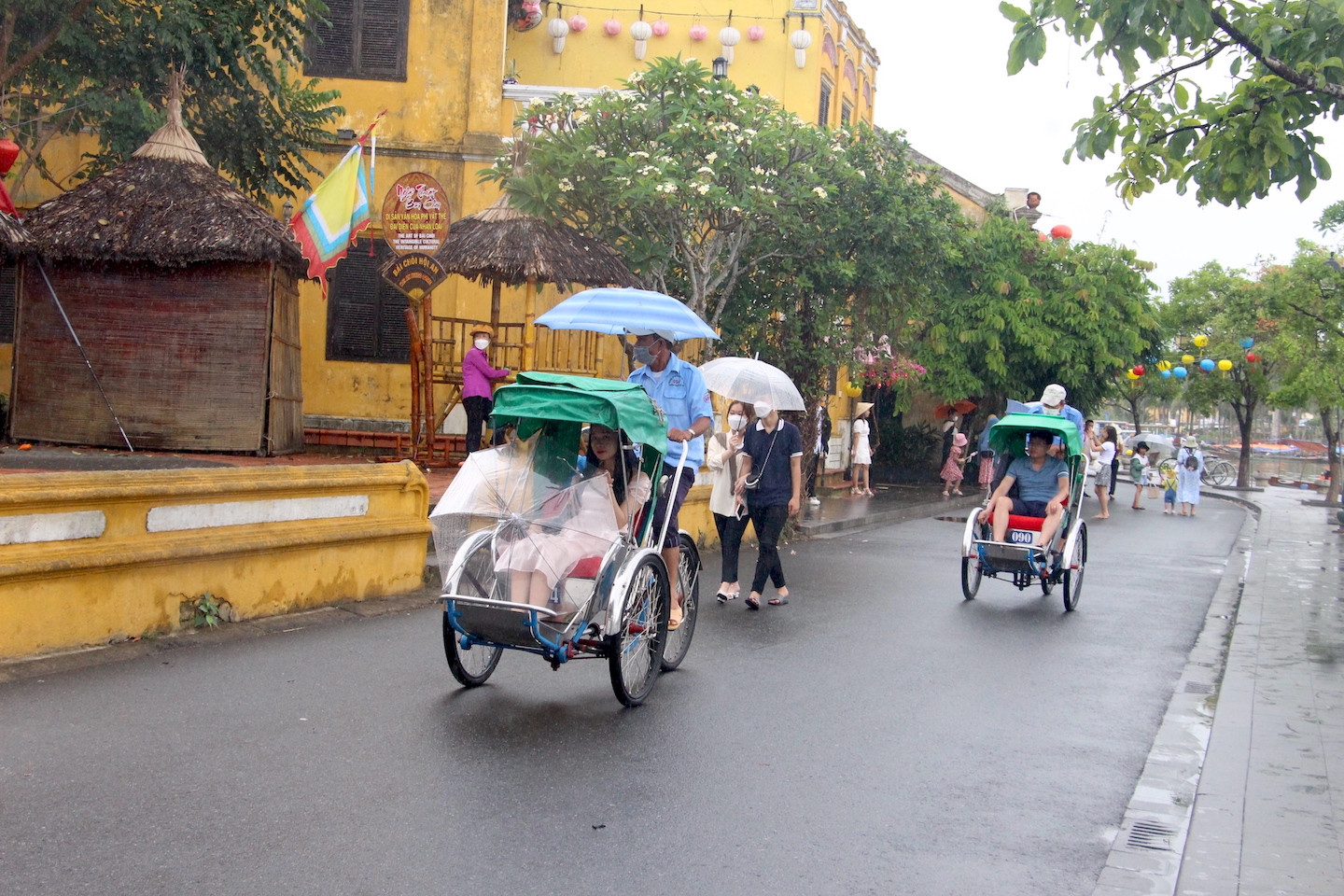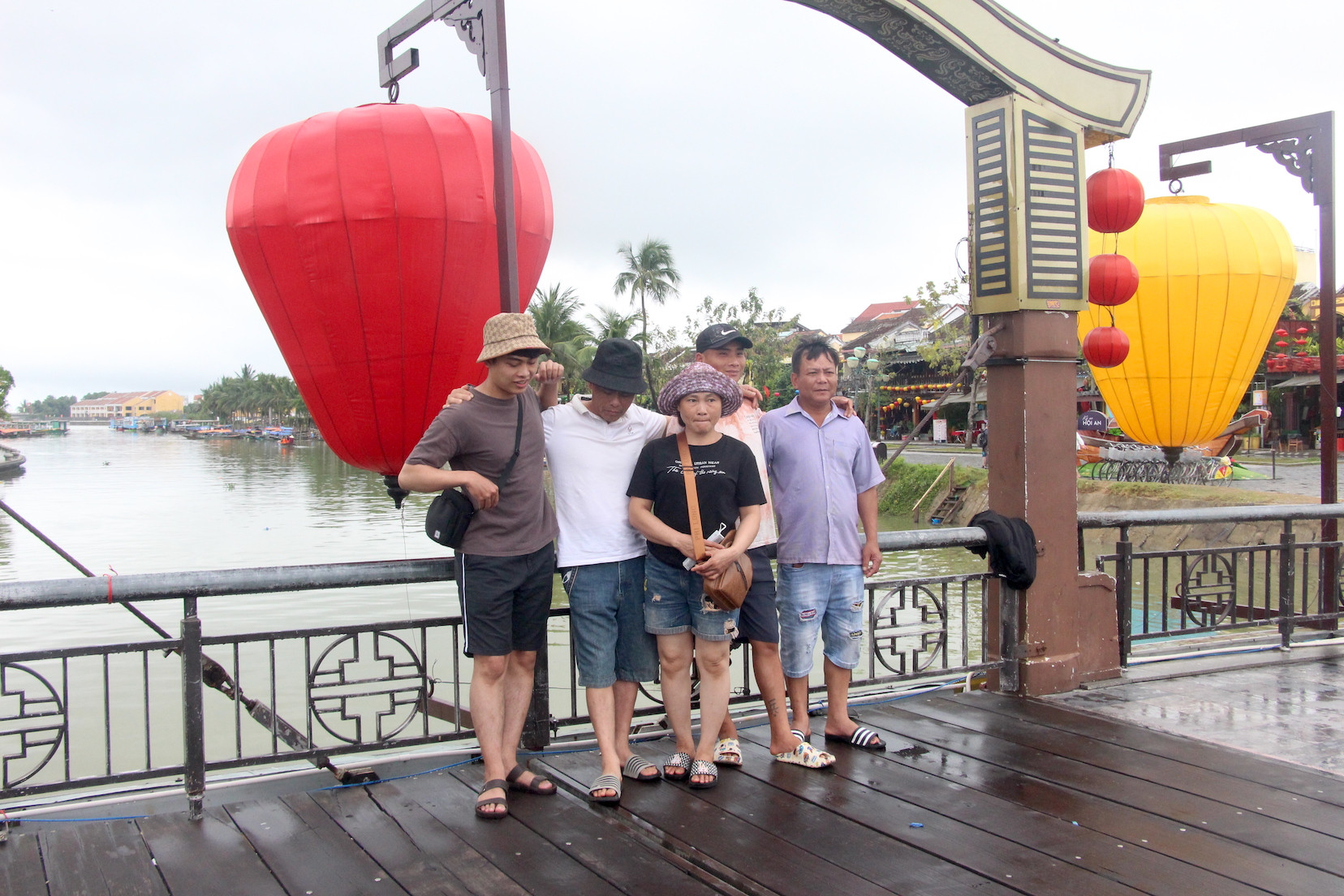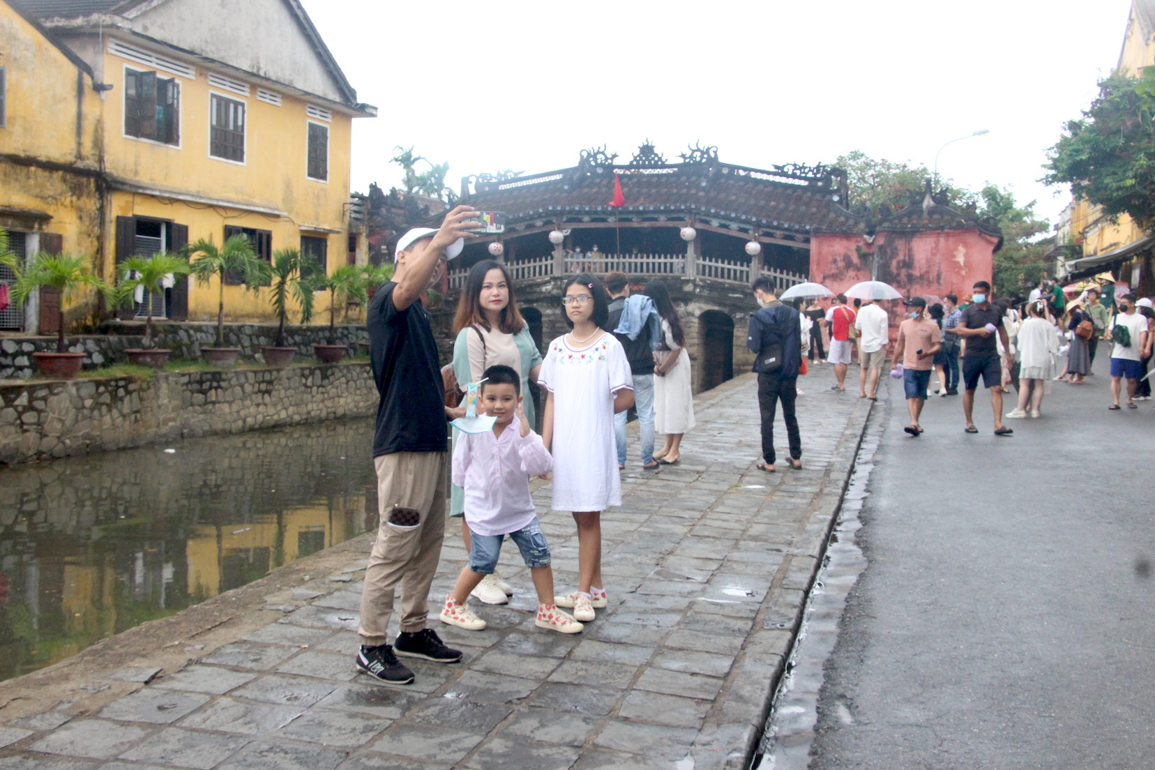 Rất đông du khách trong và ngoài nước “đội mưa” đi tham quan, chụp ảnh lưu niệm trên các tuyến đường như: Nguyễn Thái Học, Bạch Đằng, Trần Phú… Các địa điểm du lịch như Chùa Cầu, cầu An Hội cũng được du khách lựa chọn làm điểm tham quan.