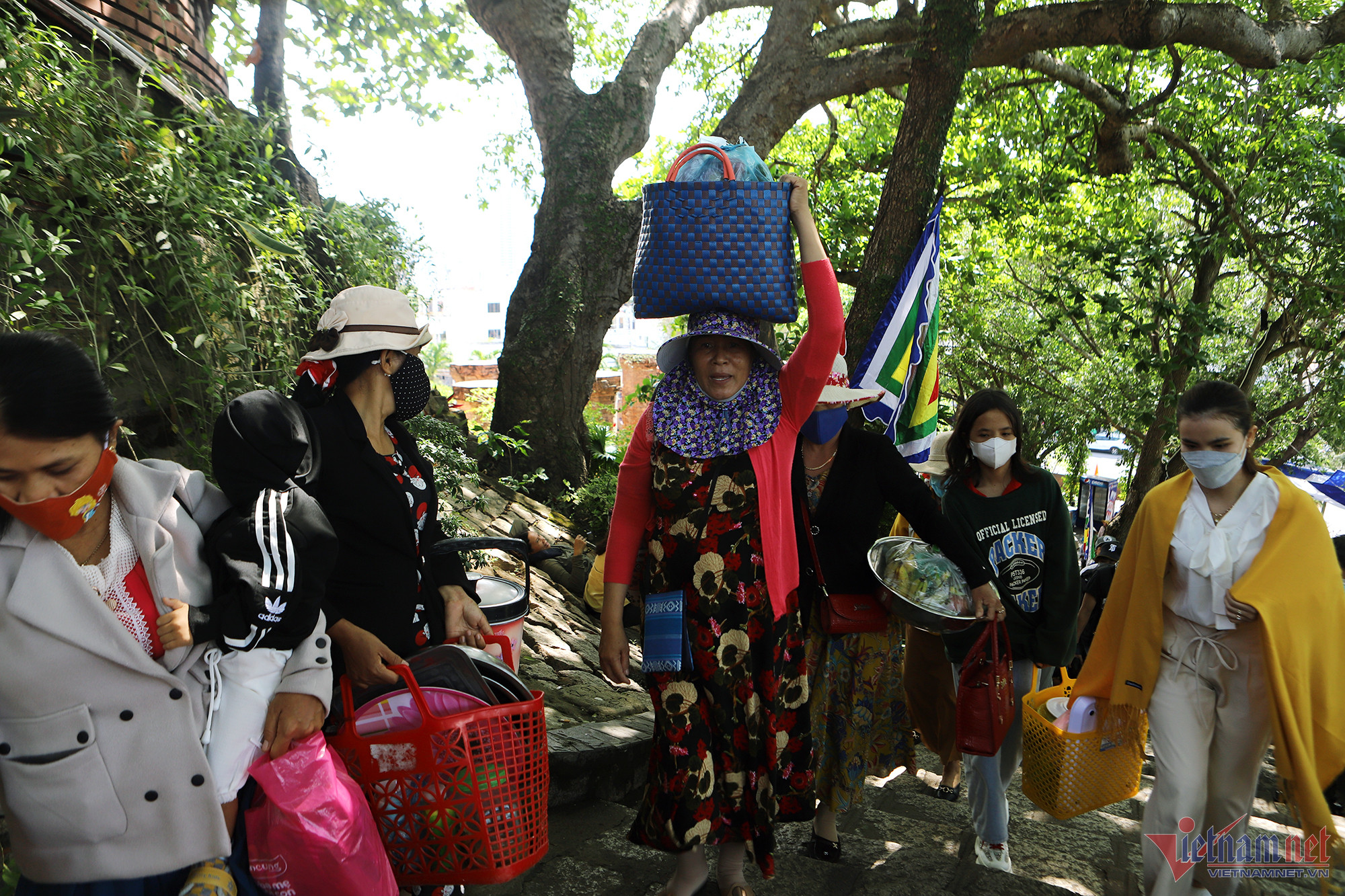 Người Chăm mang đầy đủ lễ tế như trái cây, gà, bánh... đến để dâng lên người mẹ xứ sở Thiên Y Ana Thánh Mẫu.