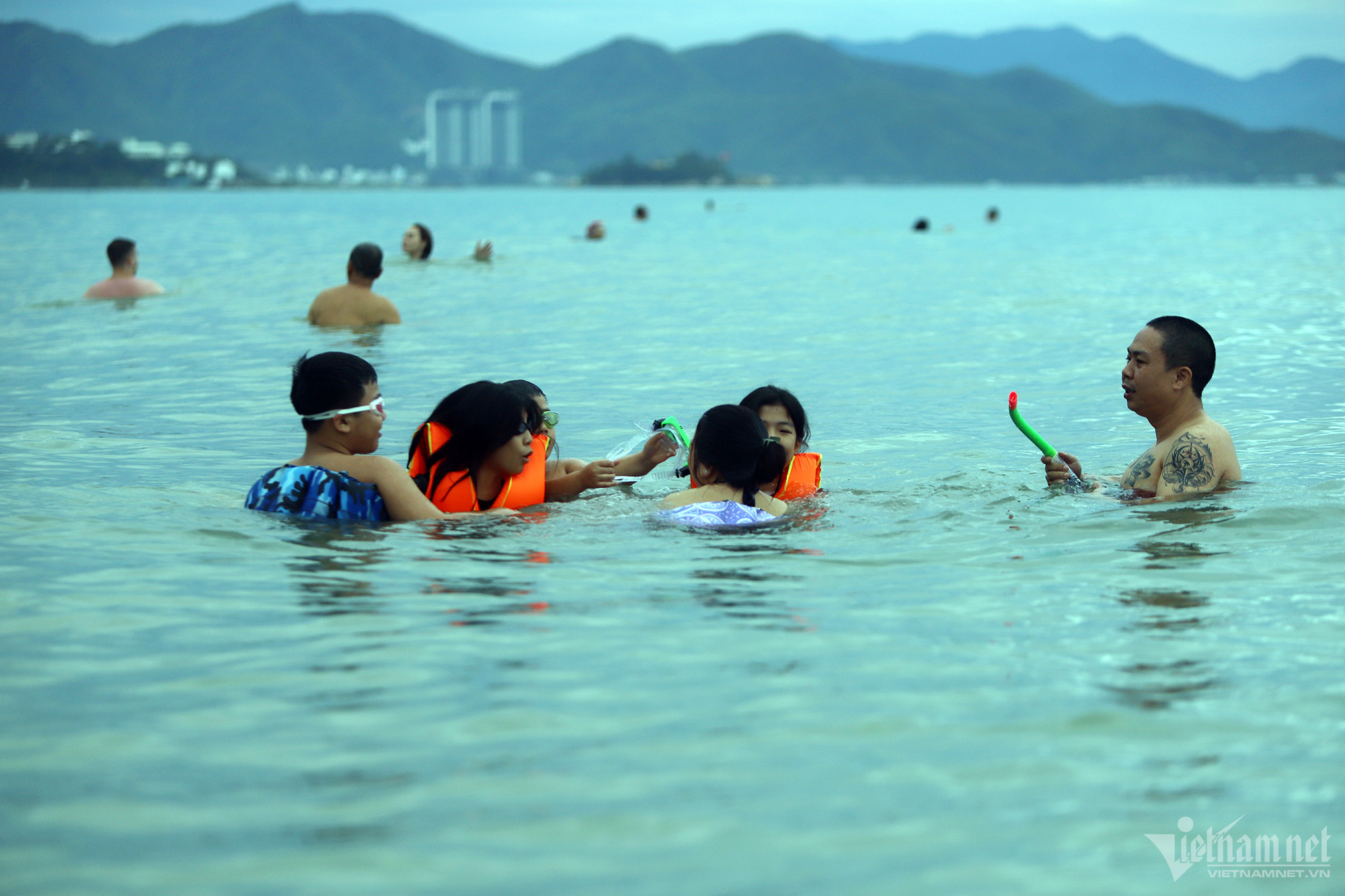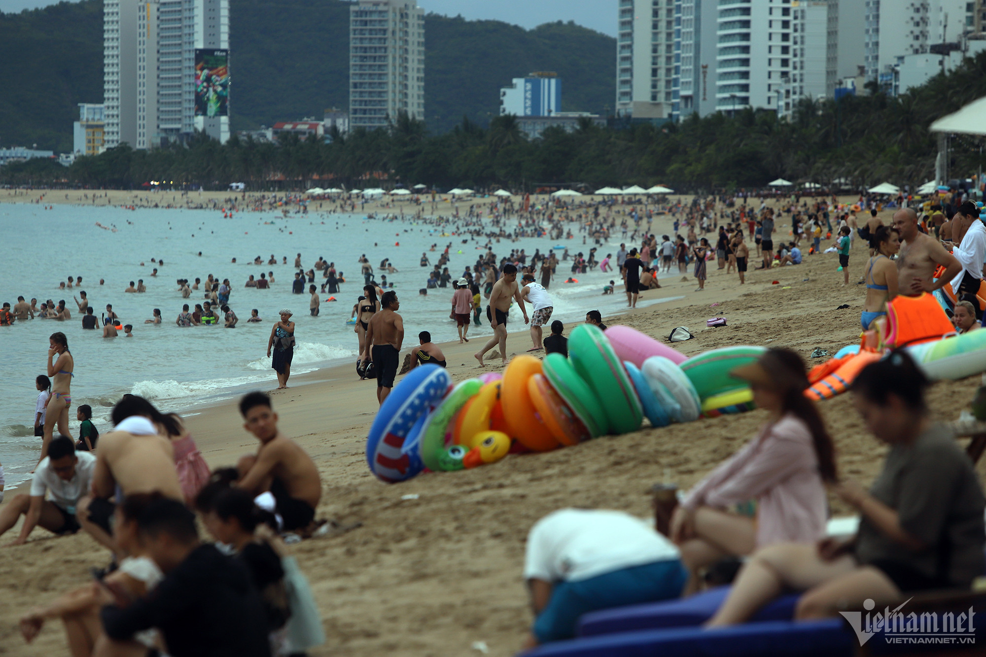Hơn 17h cùng ngày, bãi biển chật kín người. Thời tiết Nha Trang những ngày qua khá nắng nóng, mọi người chọn bãi biển là điểm đến trong ngày lễ.