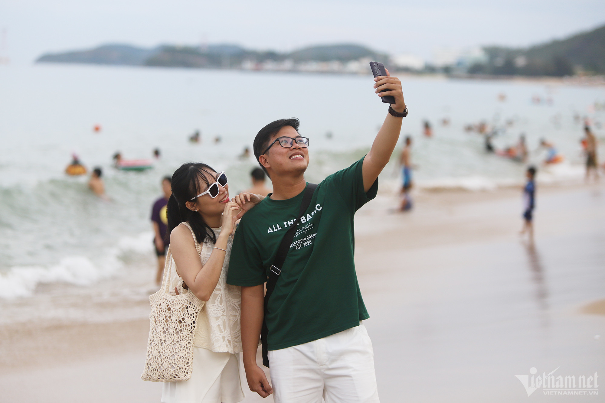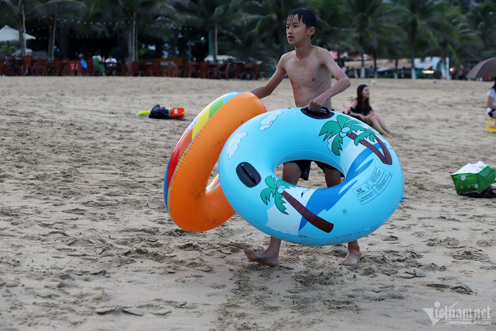 Ngày 1/9, hàng nghìn du khách, người dân đổ về tắm biển. Dọc bãi biển hơn 5km dọc đường Trần Phú bắt đầu đông. Người lớn và trẻ nhỏ nô đùa trên cát, xuống tắm.