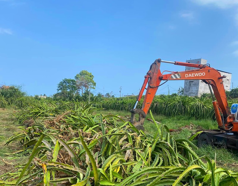 Nông dân thuê cơ giới phá bỏ vườn thanh long. Ảnh PĐ |