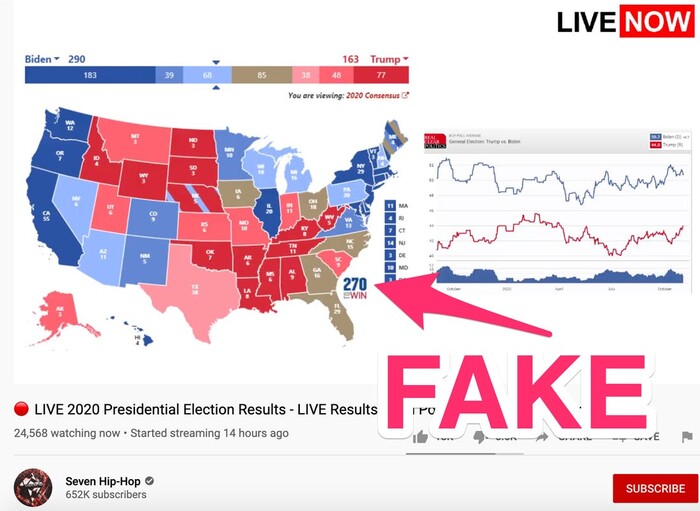 Các buổi livestream kết quả bầu cử Tổng thống Mỹ này xuất hiện ở đầu trang YouTube khi người dùng tìm kiếm cụm từ "kết quả bầu cử", và đã có đến hàng nghìn người xem trực tuyến trước khi bị gỡ bỏ. Một số buổi livestream giả mạo này còn chạy cả quảng cáo.