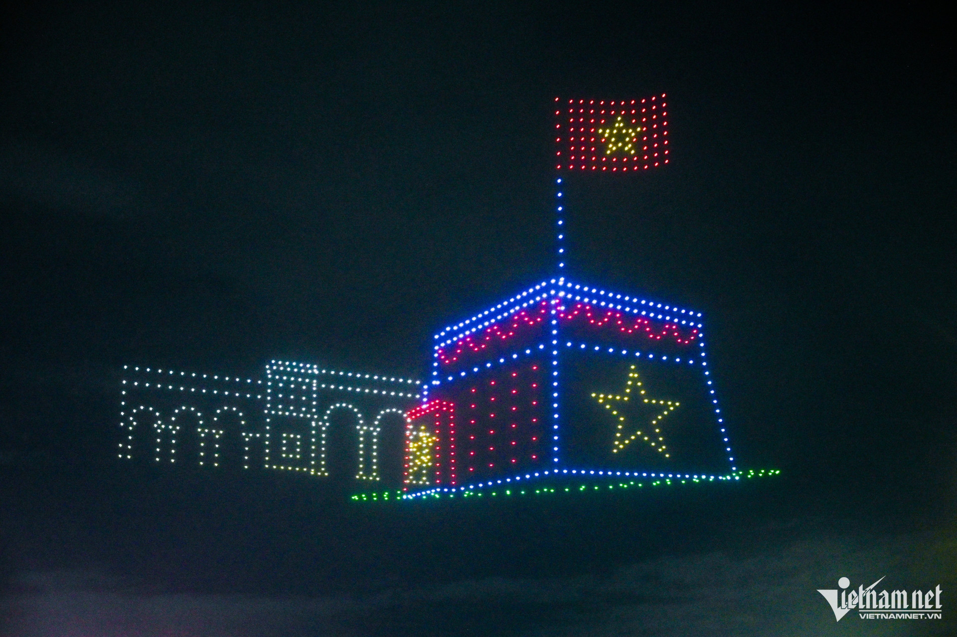 Trước đó, màn trình diễn ánh sáng với biểu tượng Cột cờ Hà Nội, Tuyên ngôn Độc lập... rực sáng trên bầu trời TPHCM.