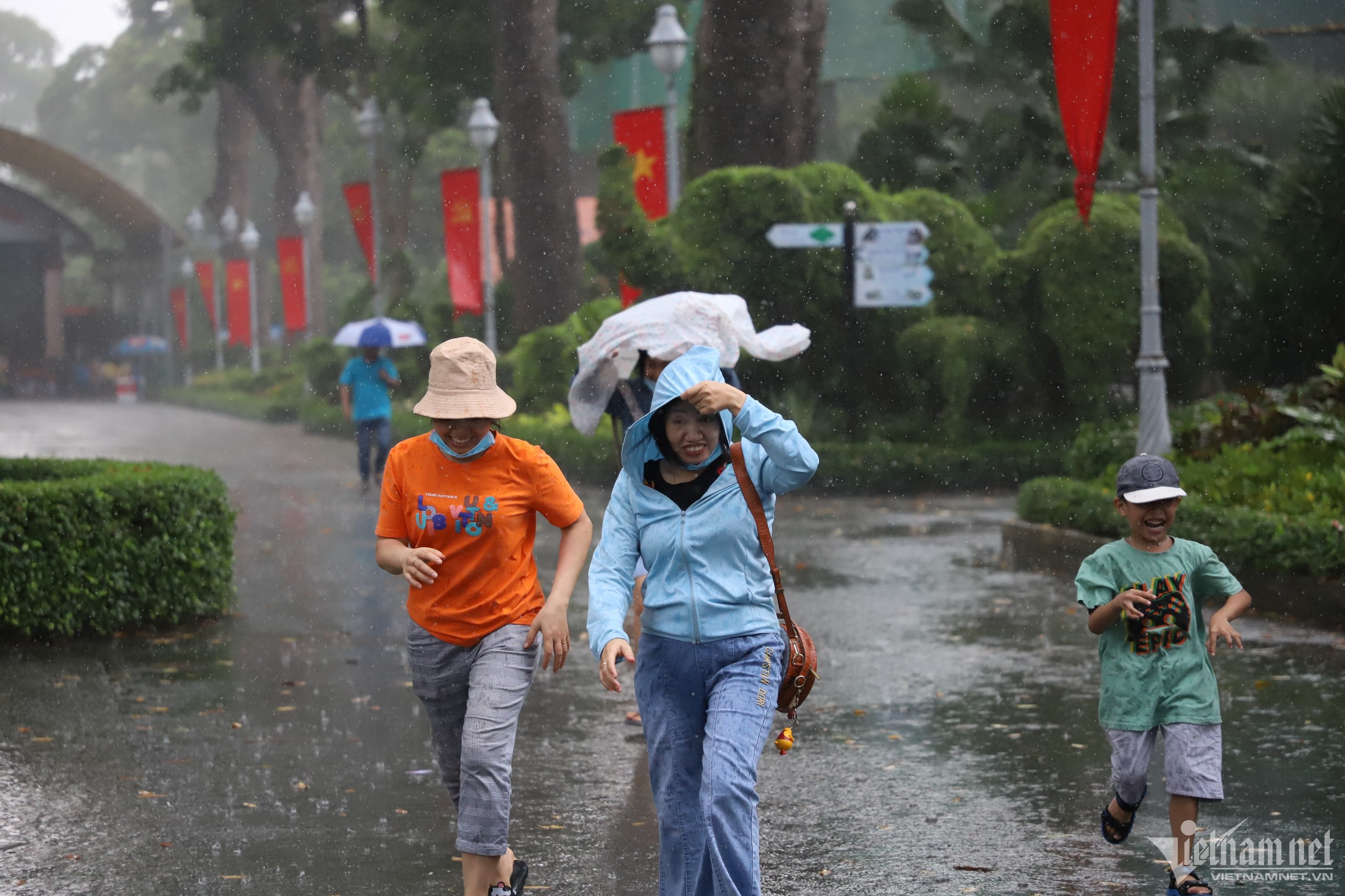 Ken đặc người tại khu vực mái che quầy kiểm soát vé vào cổng. Cơn mưa lớn kéo dài khoảng 30 phút, sau đó ngớt dần.