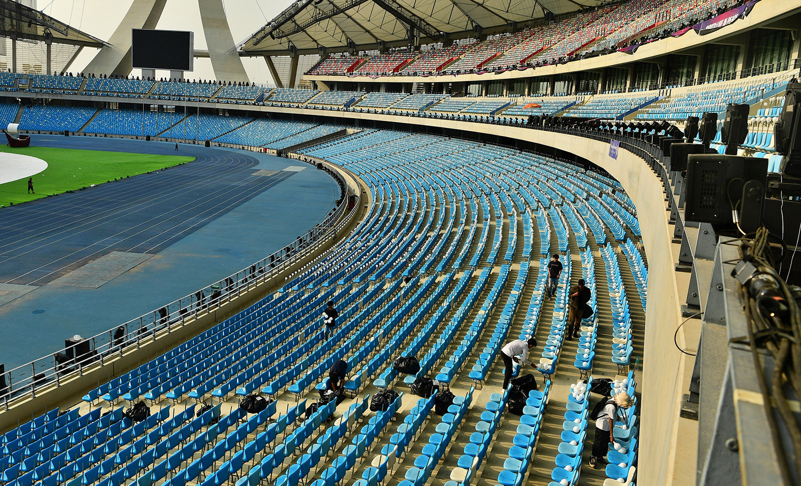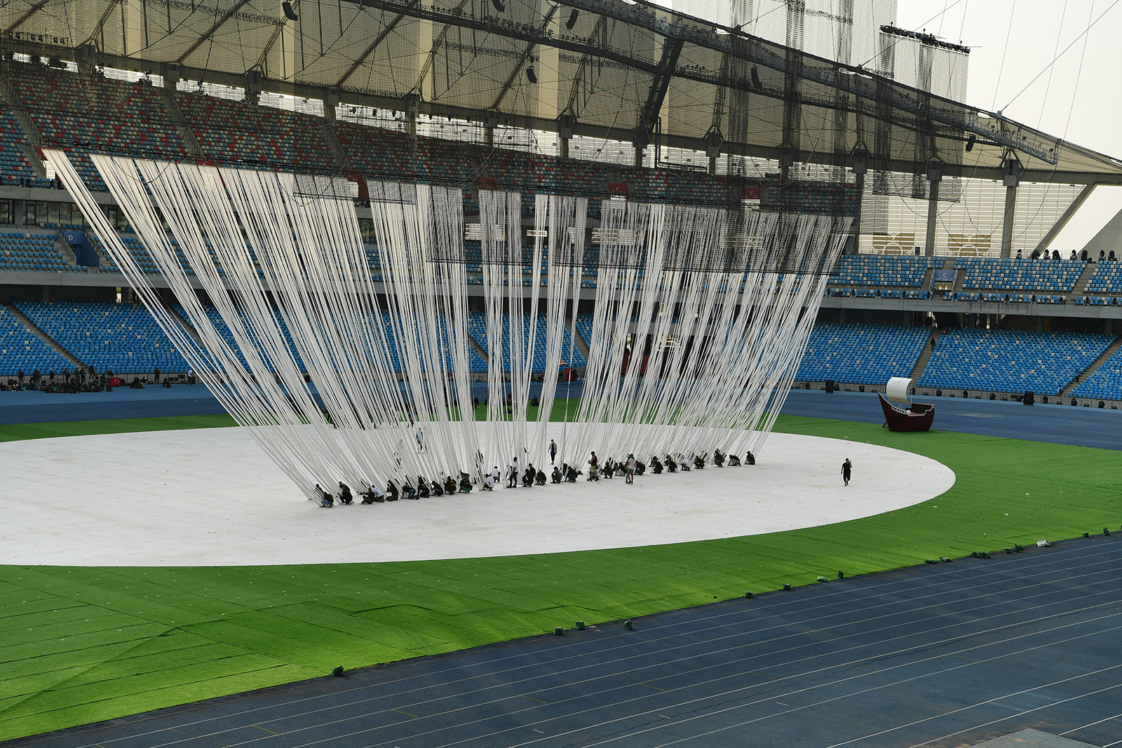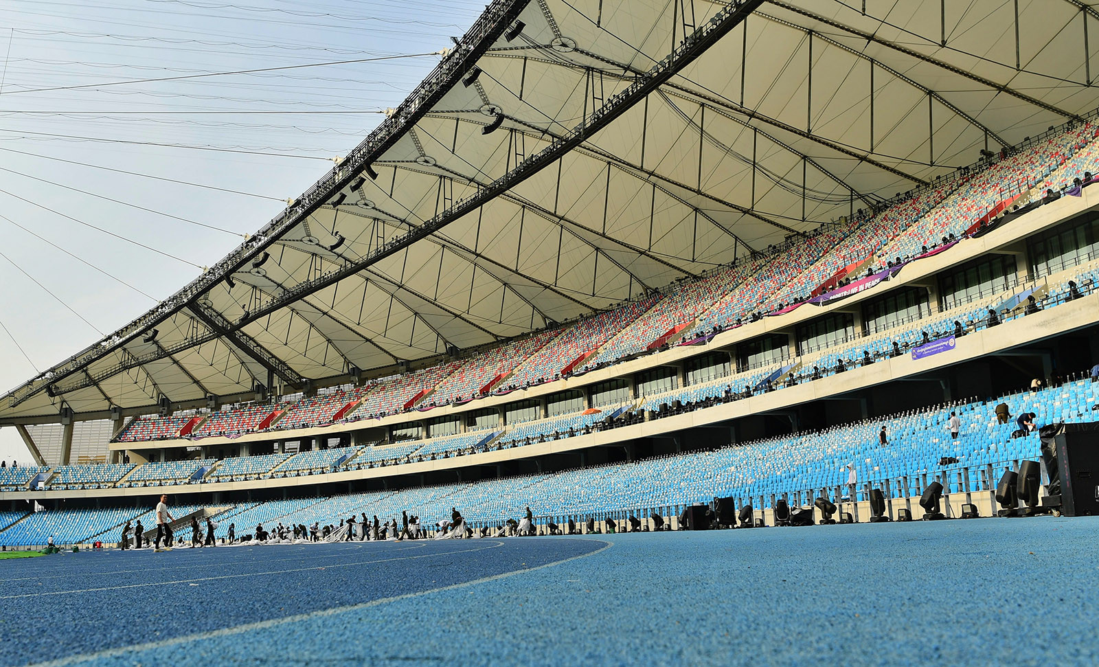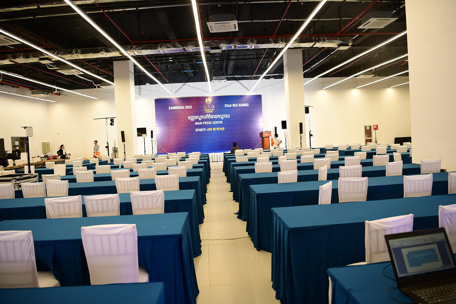 Phút nghỉ ngơi của một công nhân. Sân Morodok Techo là biểu tượng cho kỳ SEA Games 32 của chủ nhà Campuchia, có kinh phí xây dựng lên đến 160 triệu USD (gần 4000 tỷ đồng). Sân Morodok được thiết kế theo hình dạng “một chiếc thuyền buồm” với hai cấu trúc giống mũi thuyền cao 99 mét.Phía trong sân, công tác chuẩn bị rất hối hả, khẩn trương. Các hàng ghế được vệ sinh lại và lắp đặt các bóng đèn trang trí. Theo dự kiến, hàng nghìn bóng đèn trang trí sẽ được thắp sáng trong lễ khai mạc SEA Games 2023.Chủ nhà Campuchia tuyên bố sẽ mang tới một lễ khai mạc vượt tầm khu vực, hướng tới đẳng cấp Olympic.Theo một số nhật báo ở Campuchia, 3 ca khúc mang tên “Welcome Cambodia” (tạm dịch: Chào mừng đến với Campuchia), “This is our time” (Thời đại của chúng ta) và “Cambodia is our home” (Campuchia là nhà của chúng tôi) do Liên đoàn Thanh niên Campuchia (UYFC) sáng tác sẽ được biểu diễn ở đêm khai mạc. Cũng theo tiết lộ của báo chí Campuchia, Lễ khai mạc và bế mạc SEA Games 2023 được khoảng 1.000 nghệ sĩ của Bộ Văn hóa và Mỹ thuật, cùng 2.000 VĐV và quân nhân tập luyện sôi nổi để có một màn trình diễn hoành tráng.