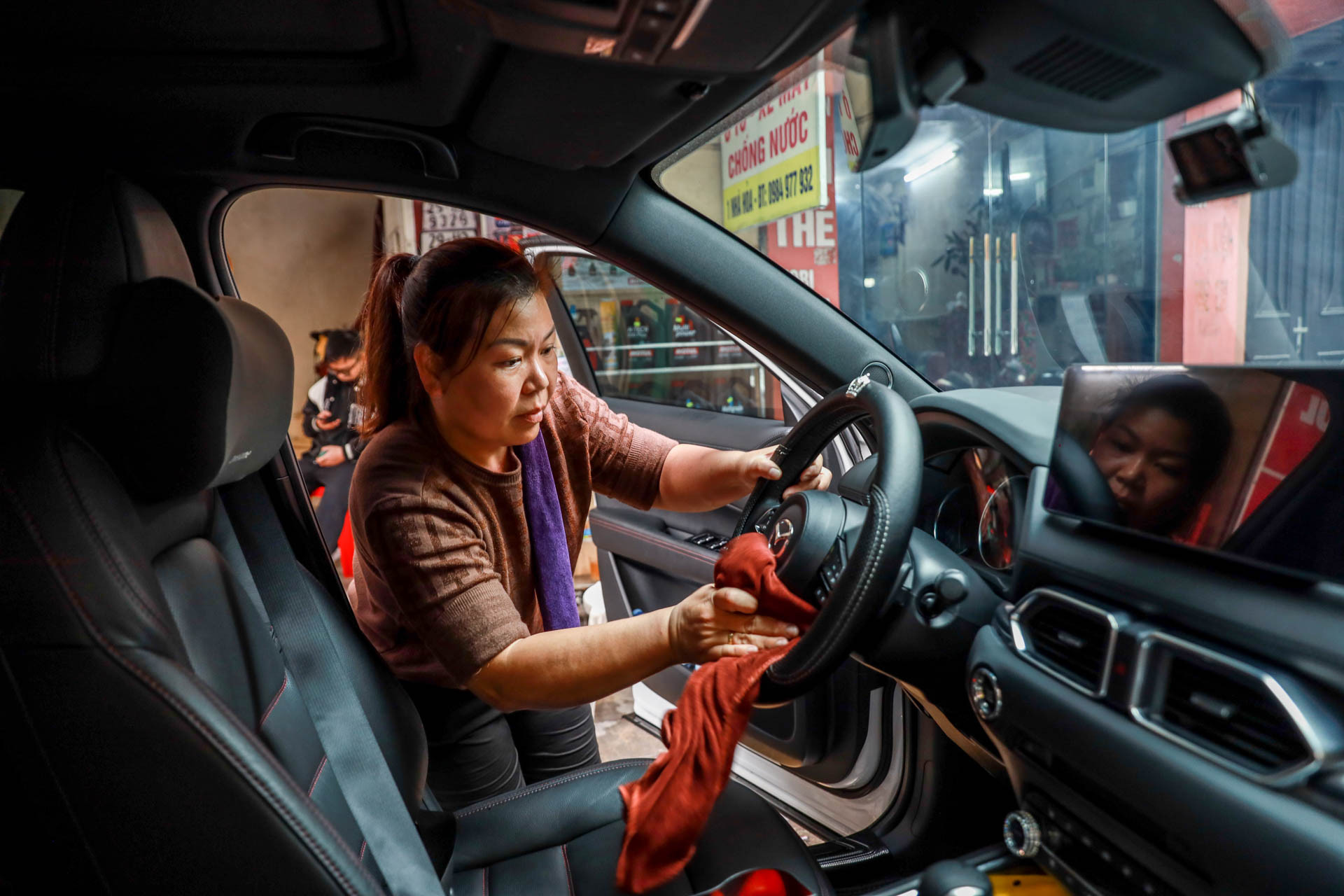 Con phố nổi tiếng này liên tục nhận các "thượng đế" vào làm dịch vụ. Tại đây những người thợ chia ra đảm nhiệm từ công đoạn rửa, phủ bọt, lau khô, hút bụi và chăm sóc nội thất...